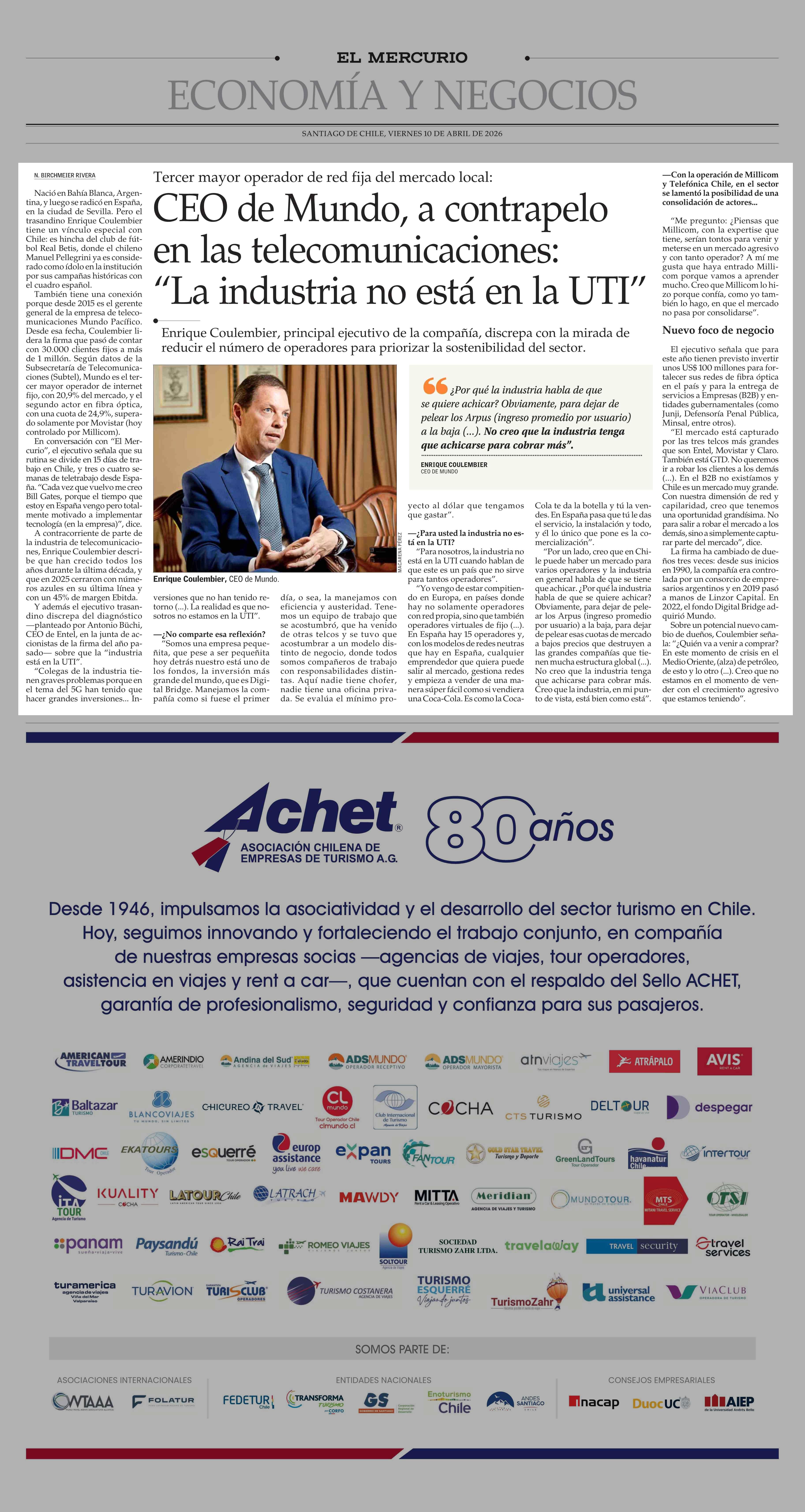CEO de Mundo, a contrapelo en las telecomunicaciones: “La industria no está en la UTI” 10-04-2026 El Mercurio |