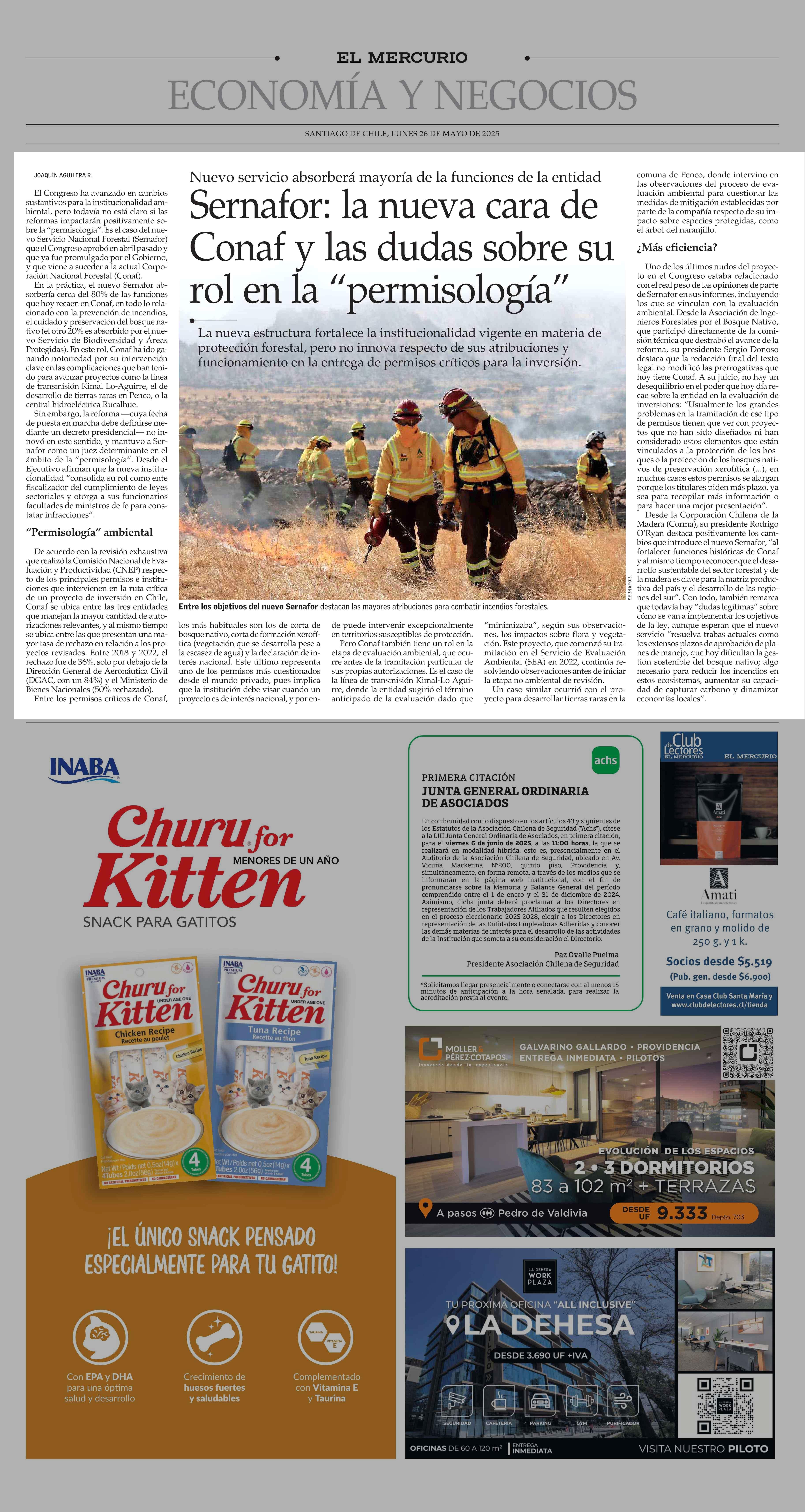 Sernafor: la nueva cara de Conaf y las dudas sobre su rol en la "permisología" 26-05-2025 El Mercurio |