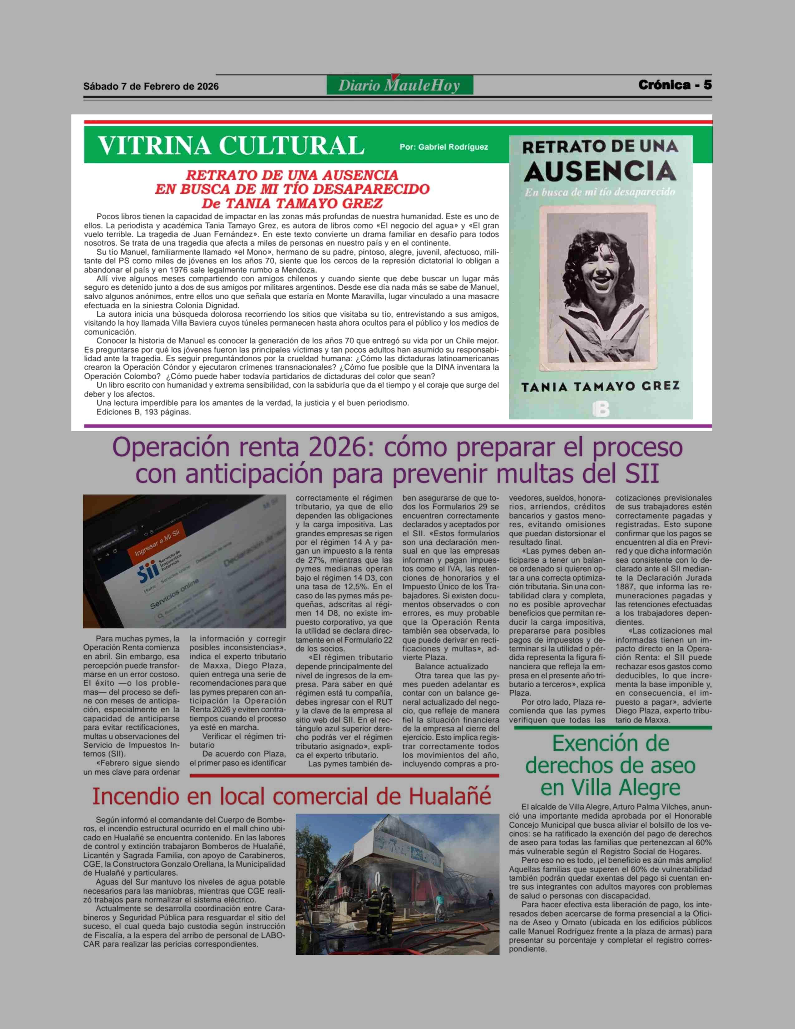 RETRATO DE UNA AUSENCIA EN BUSCA DE MI TÍO DESAPARECIDO De TANIA TAMAYO GREZ 07-02-2026 Maule Hoy |