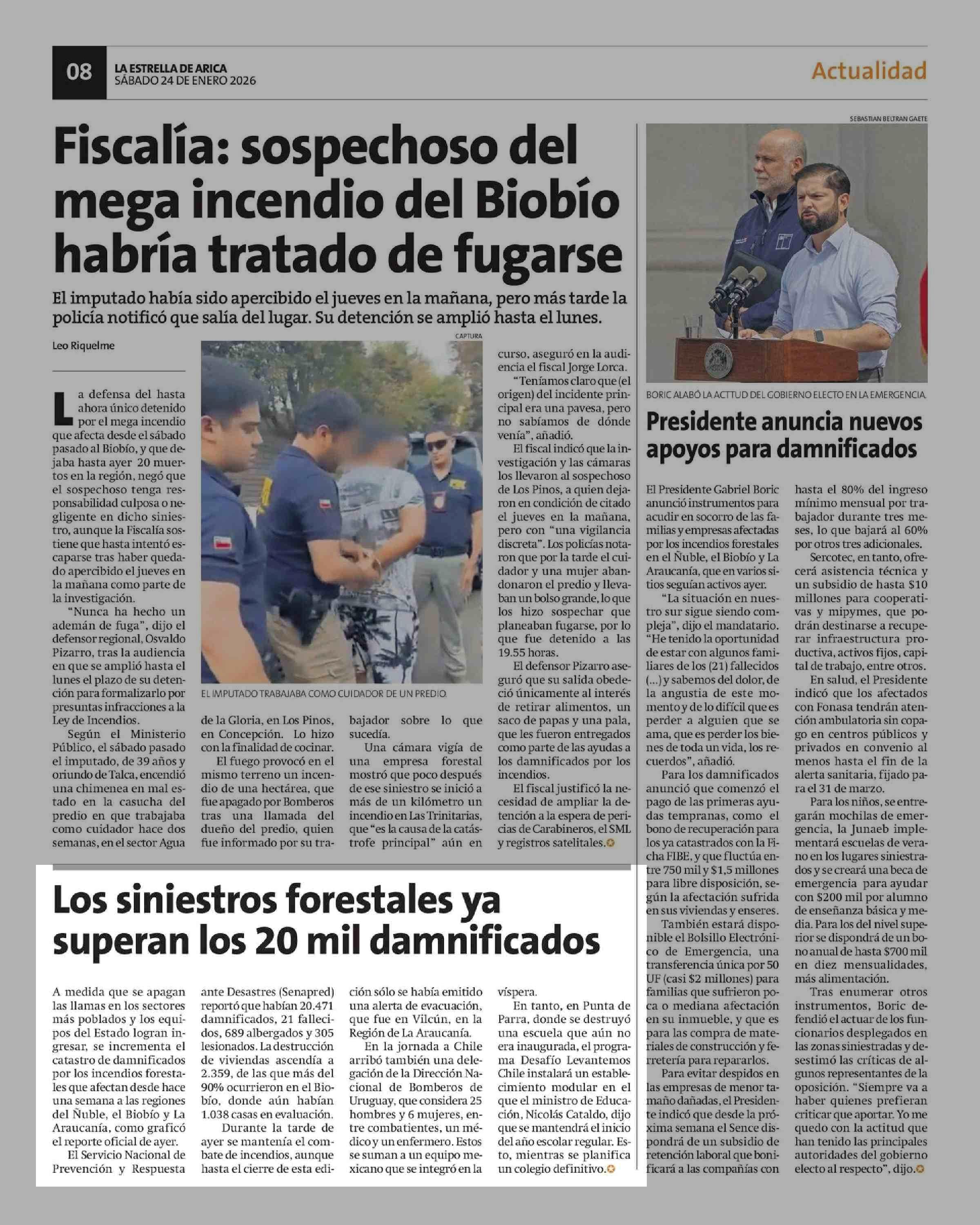 Los siniestros forestales ya superan los 20 mil damnificados 24-01-2026 La Estrella de Arica |