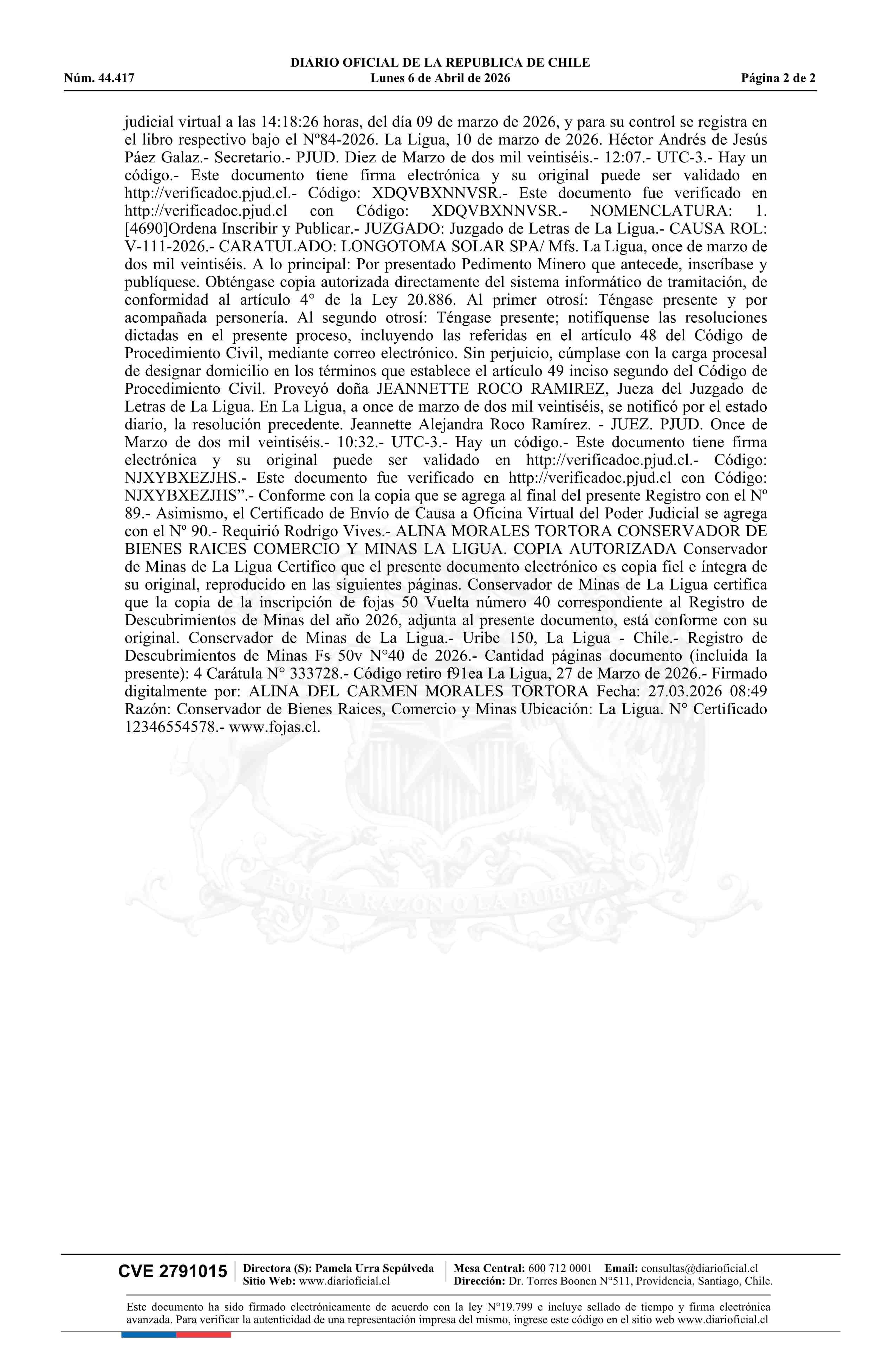 LONGOTOMA II 2 / Longotoma Solar SpA 06-04-2026 DIARIO OFICIAL CHILE - BOLETÍN OFICIAL DE MINERÍA |