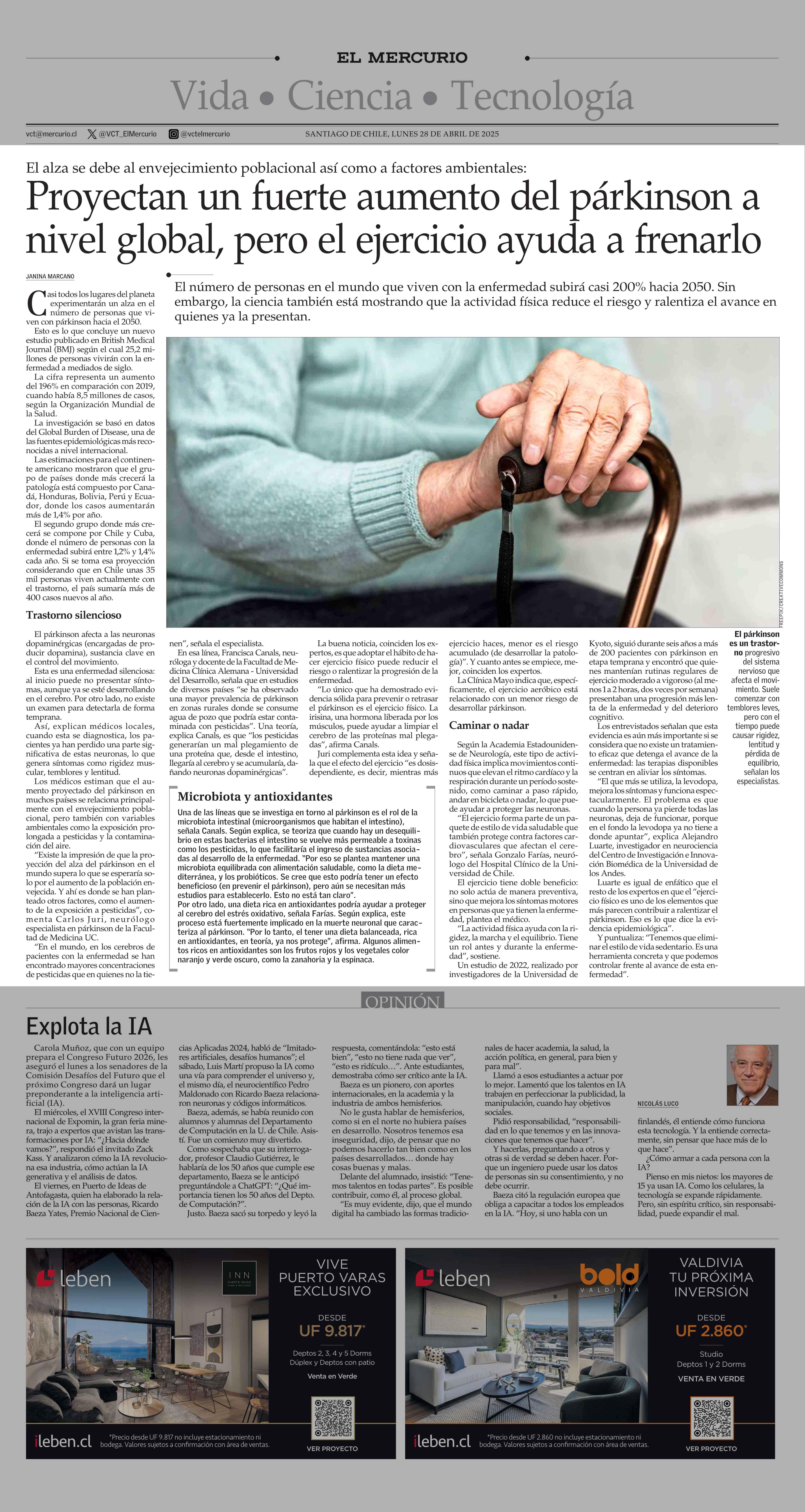 Proyectan un fuerte aumento del párkinson a nivel global, pero el ejercicio ayuda a frenarlo 28-04-2025 El Mercurio |