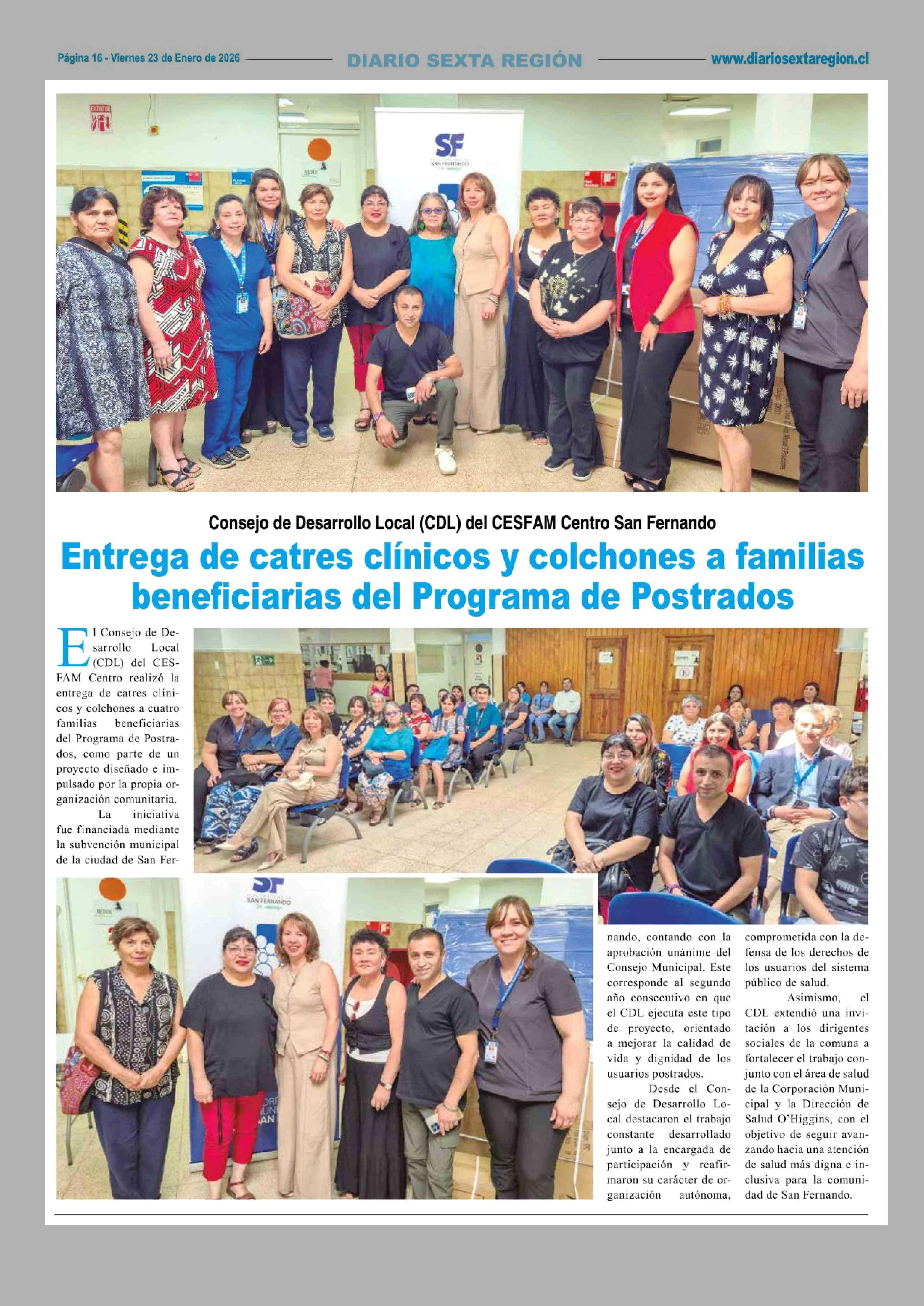 Entrega de catres clínicos y colchones a familias beneficiarias del Programa de Postrados 23-01-2026 Diario VI Región |