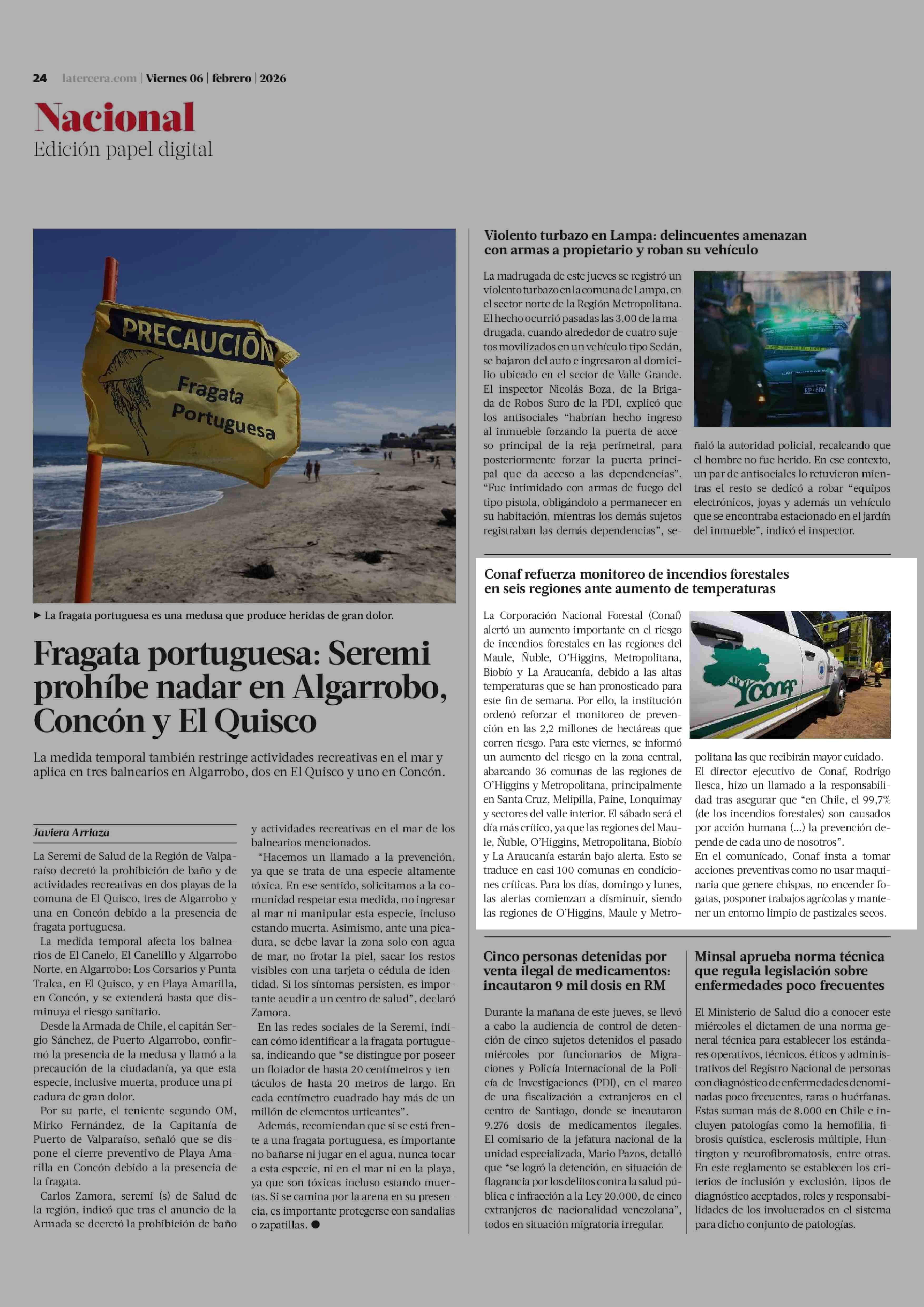 Conaf refuerza monitoreo de incendios forestales en seis regiones ante aumento de temperaturas 06-02-2026 La Tercera |