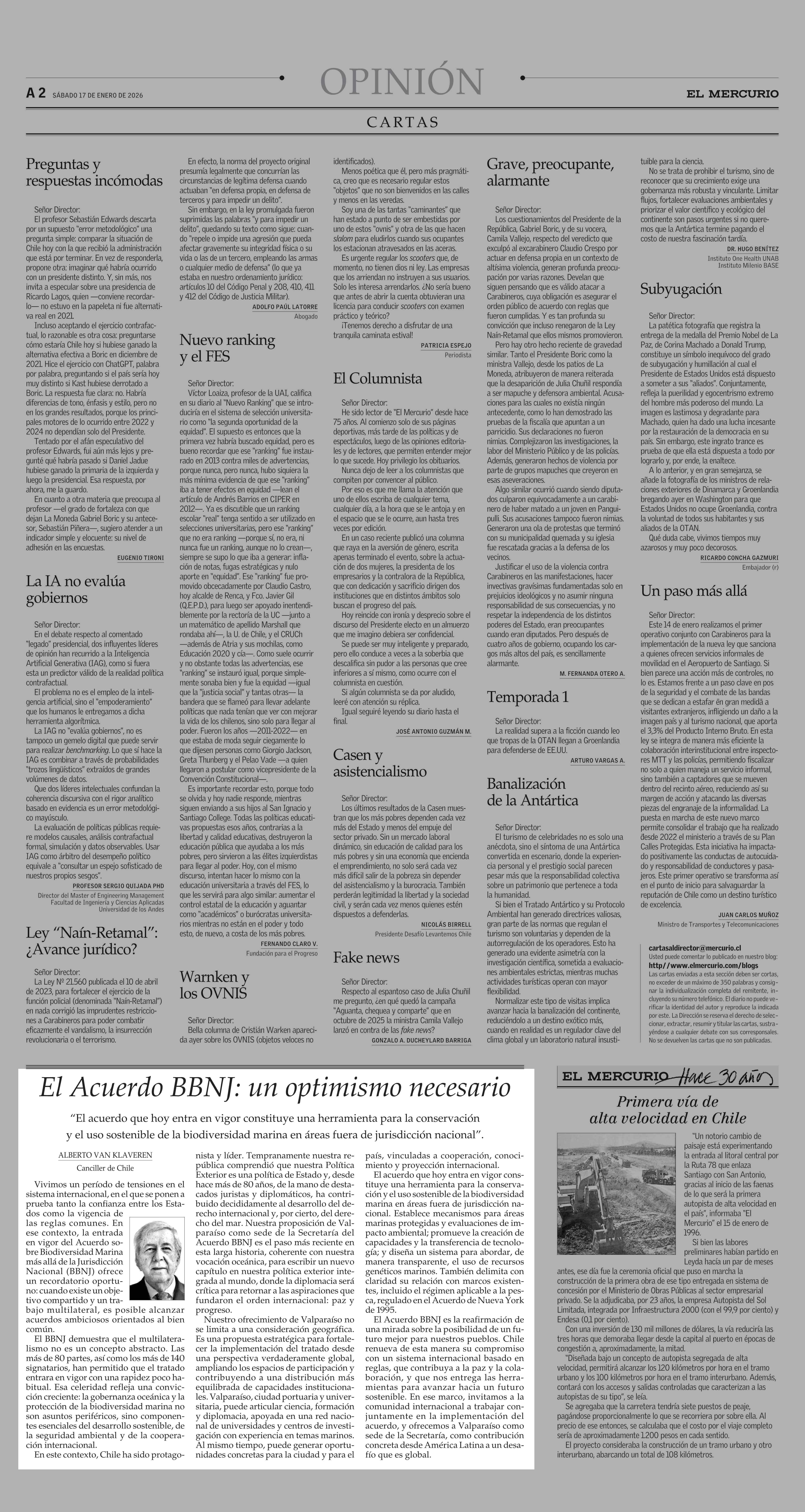 Columnas de Opinión: El Acuerdo BBNJ: un optimismo necesario 17-01-2026 El Mercurio |