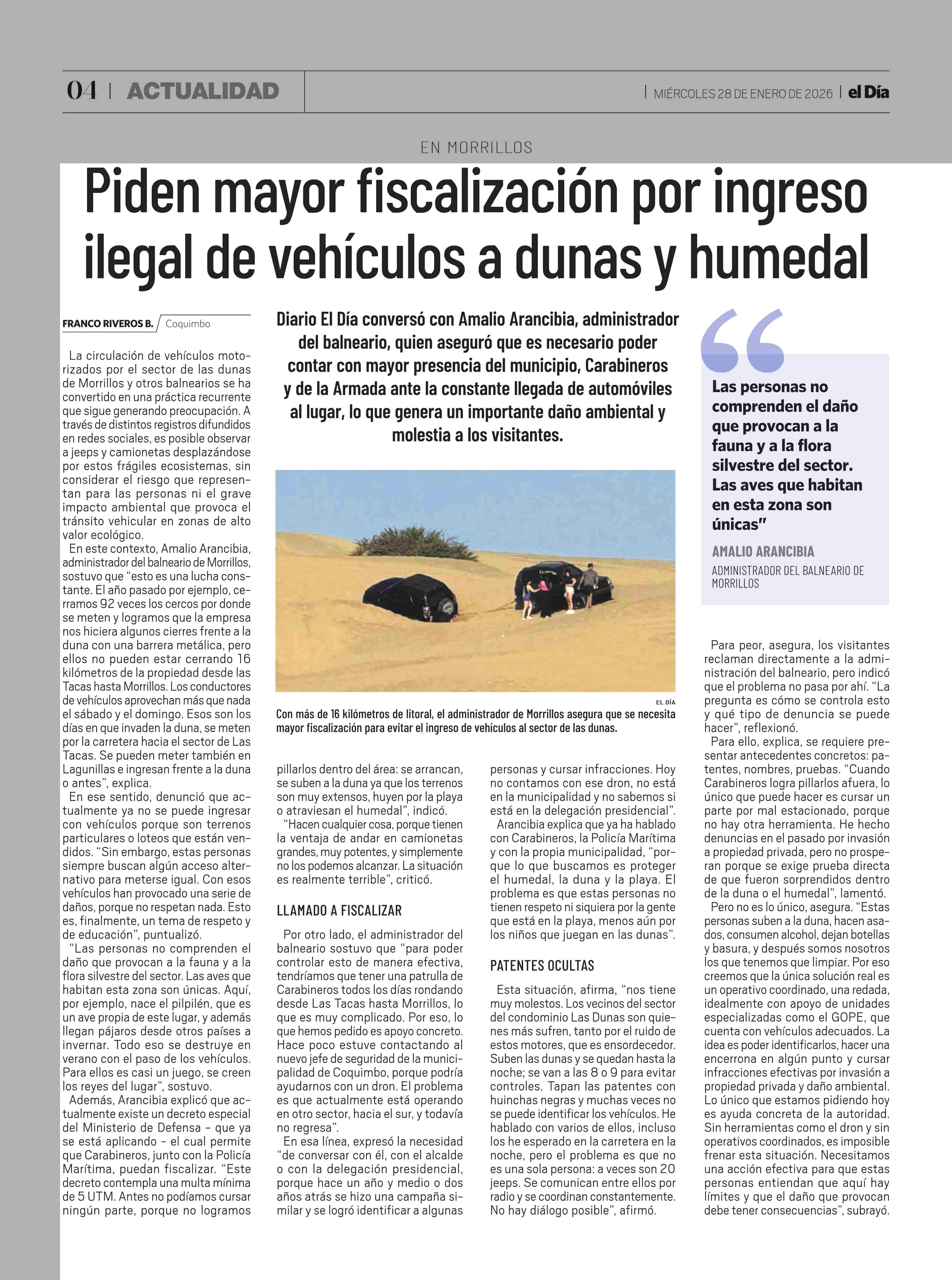 Título: Piden mayor fiscalización por ingreso Ilegal de vehículos a dunas y humedal