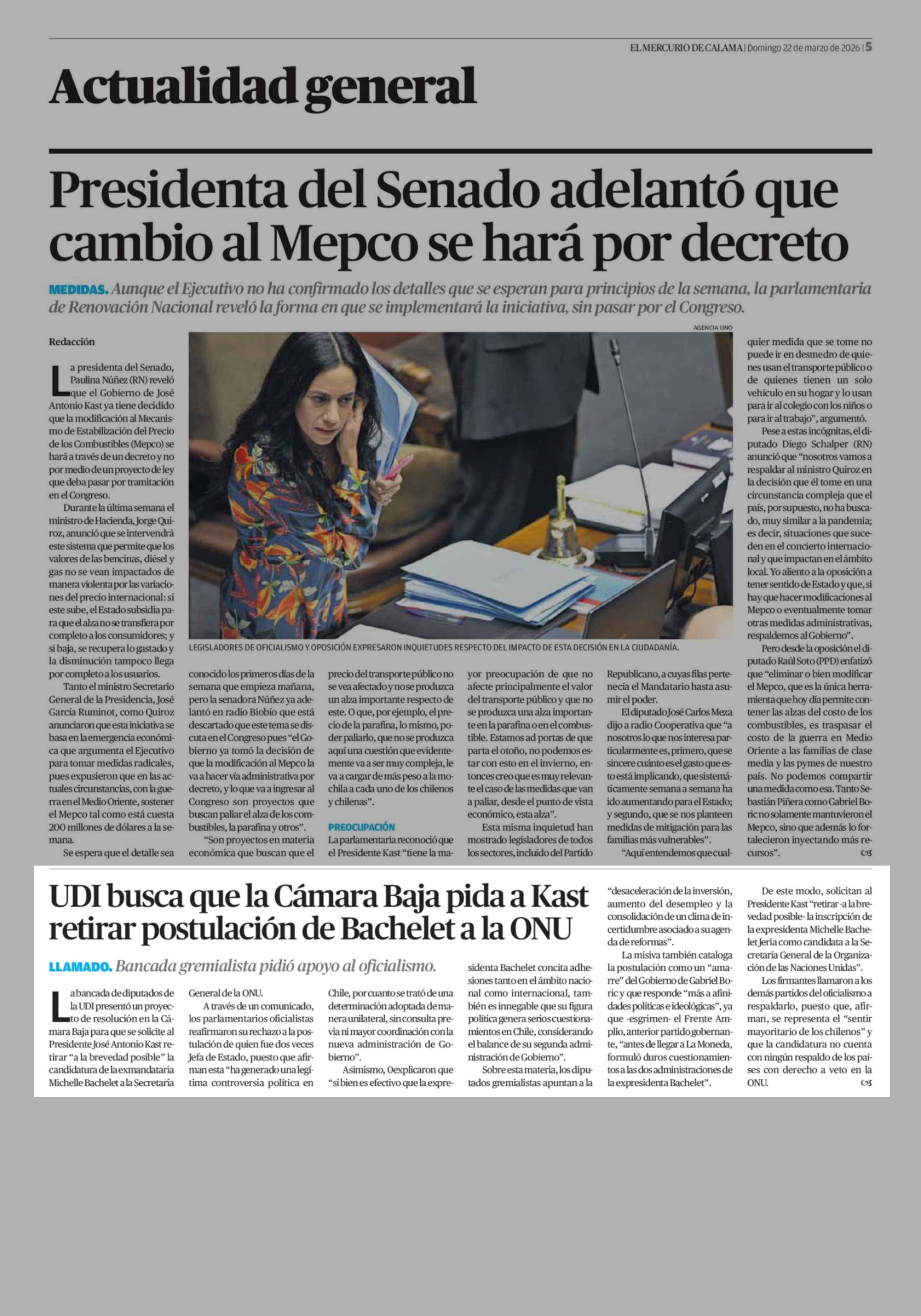 UDI busca que la Cámara Baja pida a Kast retirar postulación de Bachelet a la ONU 22-03-2026 El Mercurio de Calama |