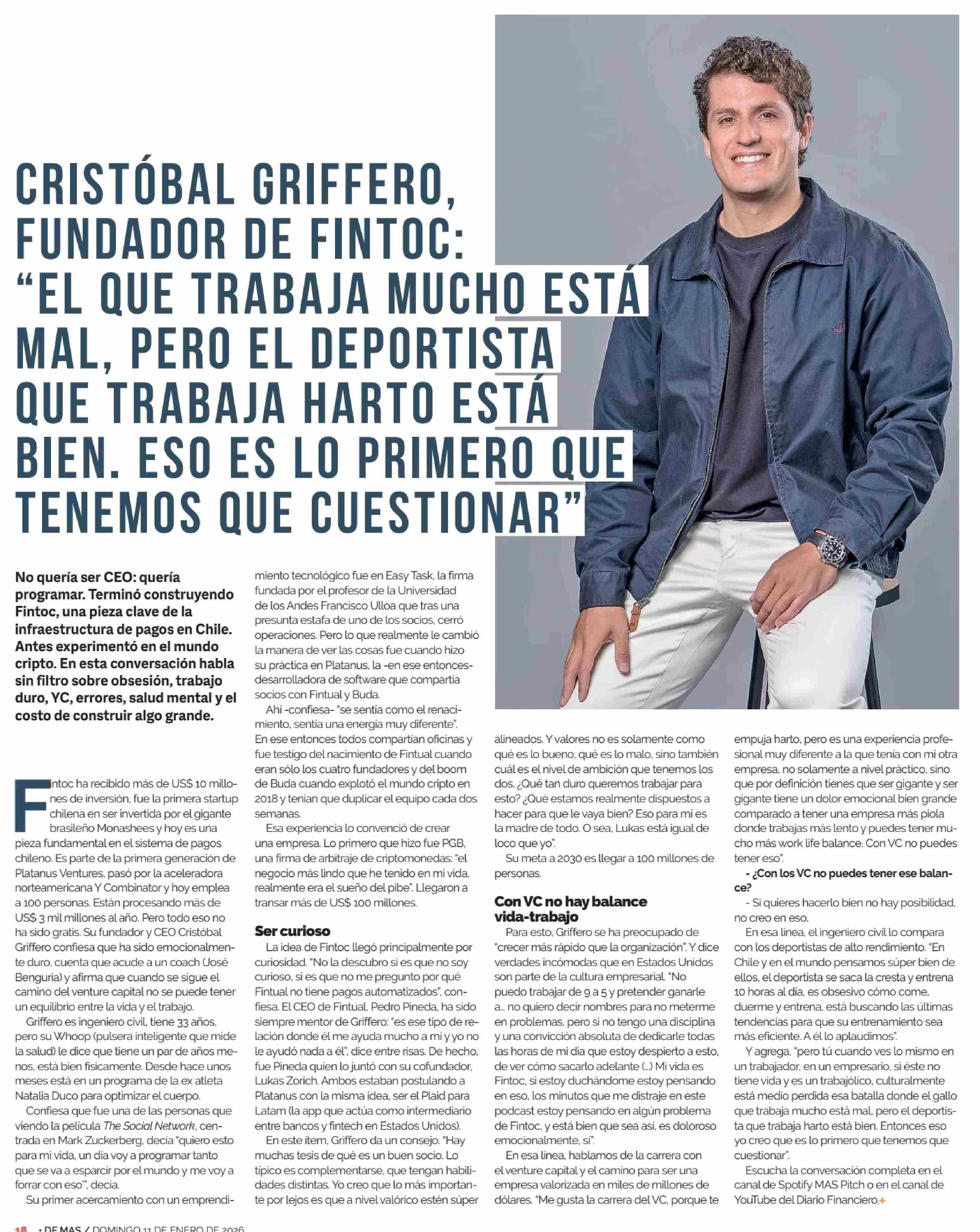 CRISTÓBAL GRIFFERO, FUNDADOR DE FINTOC: "EL QUE TRABAJA MUCHO ESTA MAL, PERO EL DEPORTISTA QUE TRABAJA HARTO ESTÁ BIEN. ESO ES LO PRIMERO QUE TENEMOS QUE CUESTIONAR" 11-01-2026 Diario Financiero |