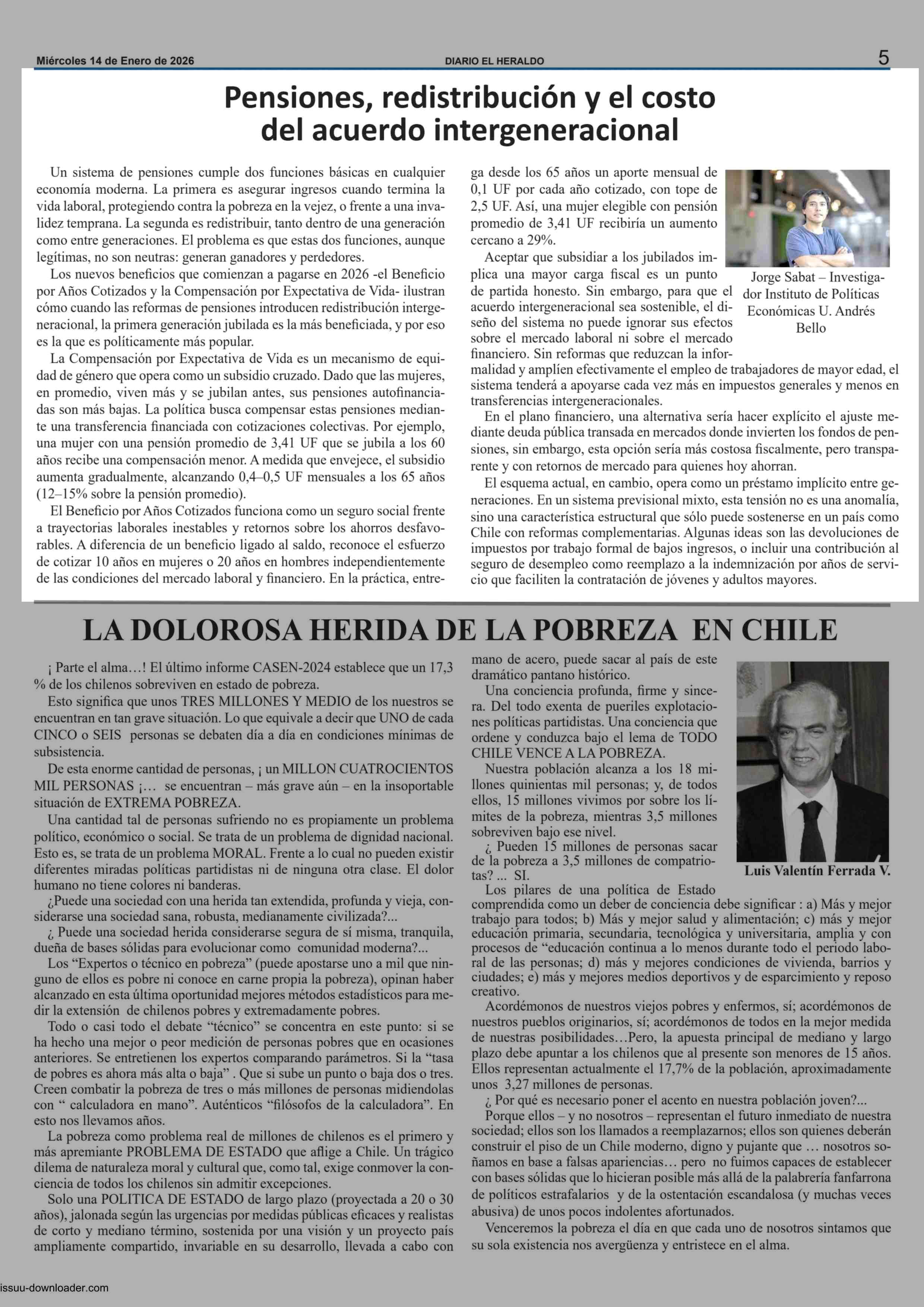 Columnas de Opinión: Pensiones, redistribución y el costo del acuerdo intergeneracional 14-01-2026 El Heraldo |