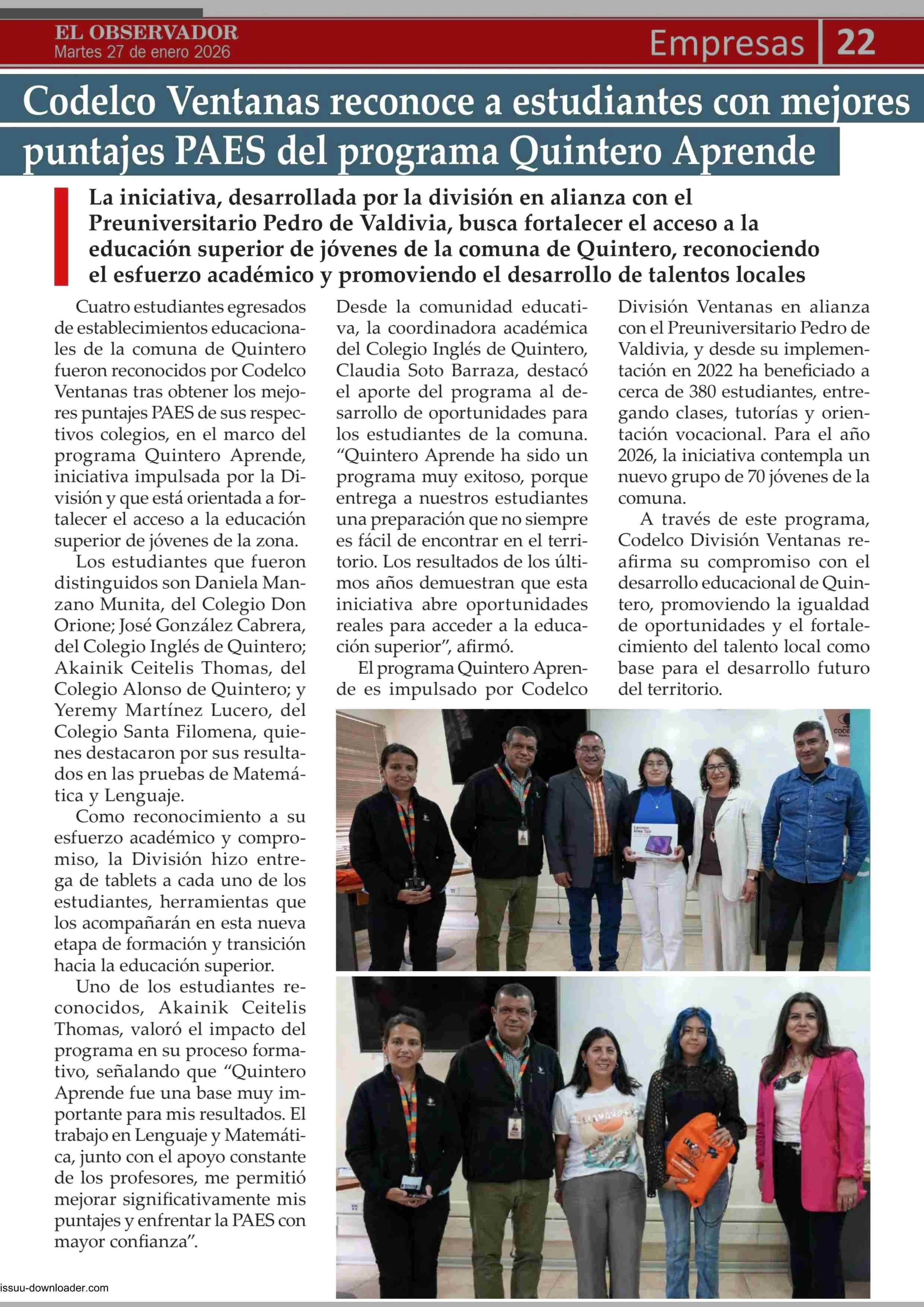 Título: Codelco Ventanas reconoce a estudiantes con mejores puntajes PAES del programa Quintero Aprende