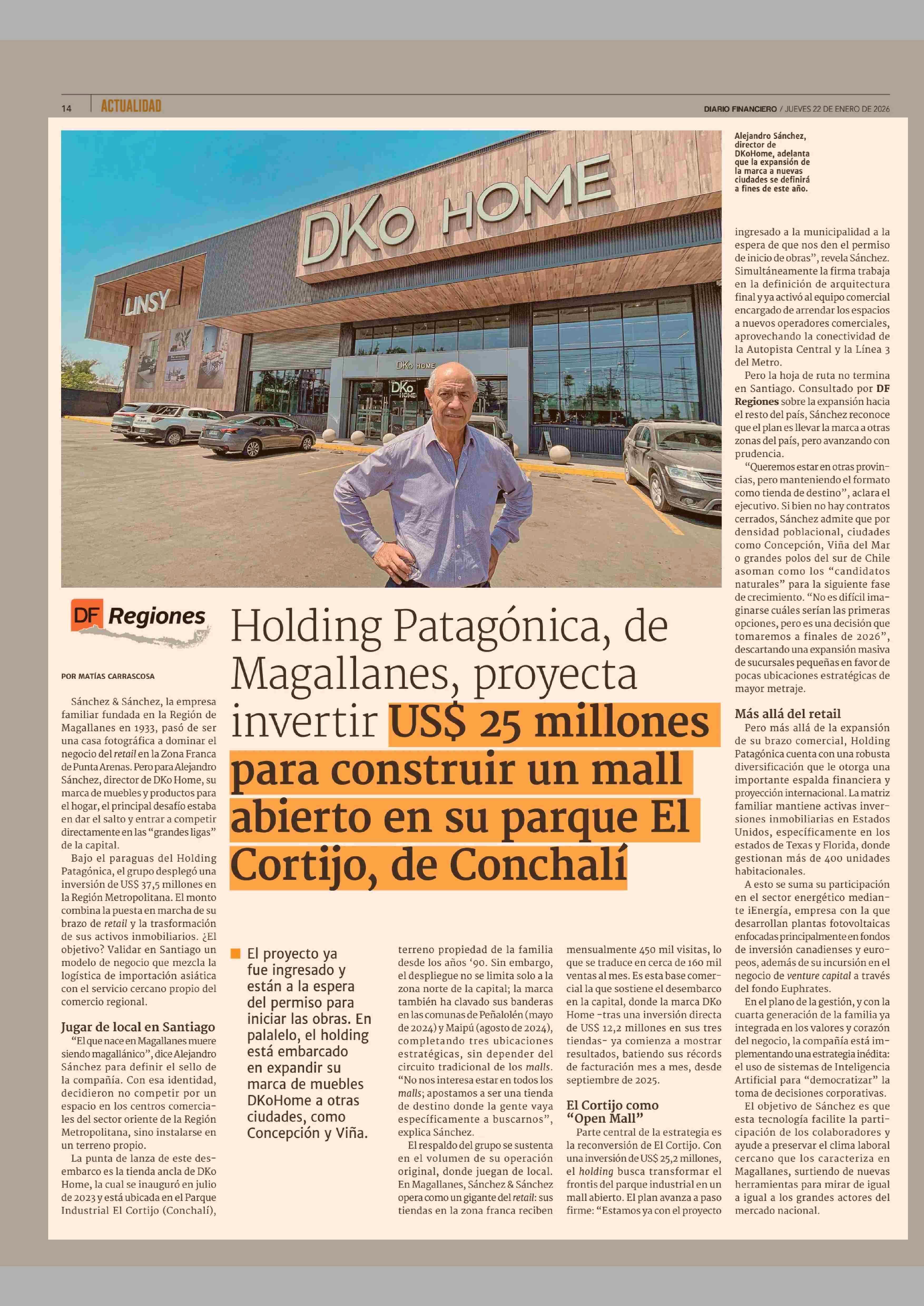 Holding Patagónica, de Magallanes, proyecta invertir US$ 25 millones para construir un mall abierto en su parque El Cortijo, de Conchalí 22-01-2026 Diario Financiero |
