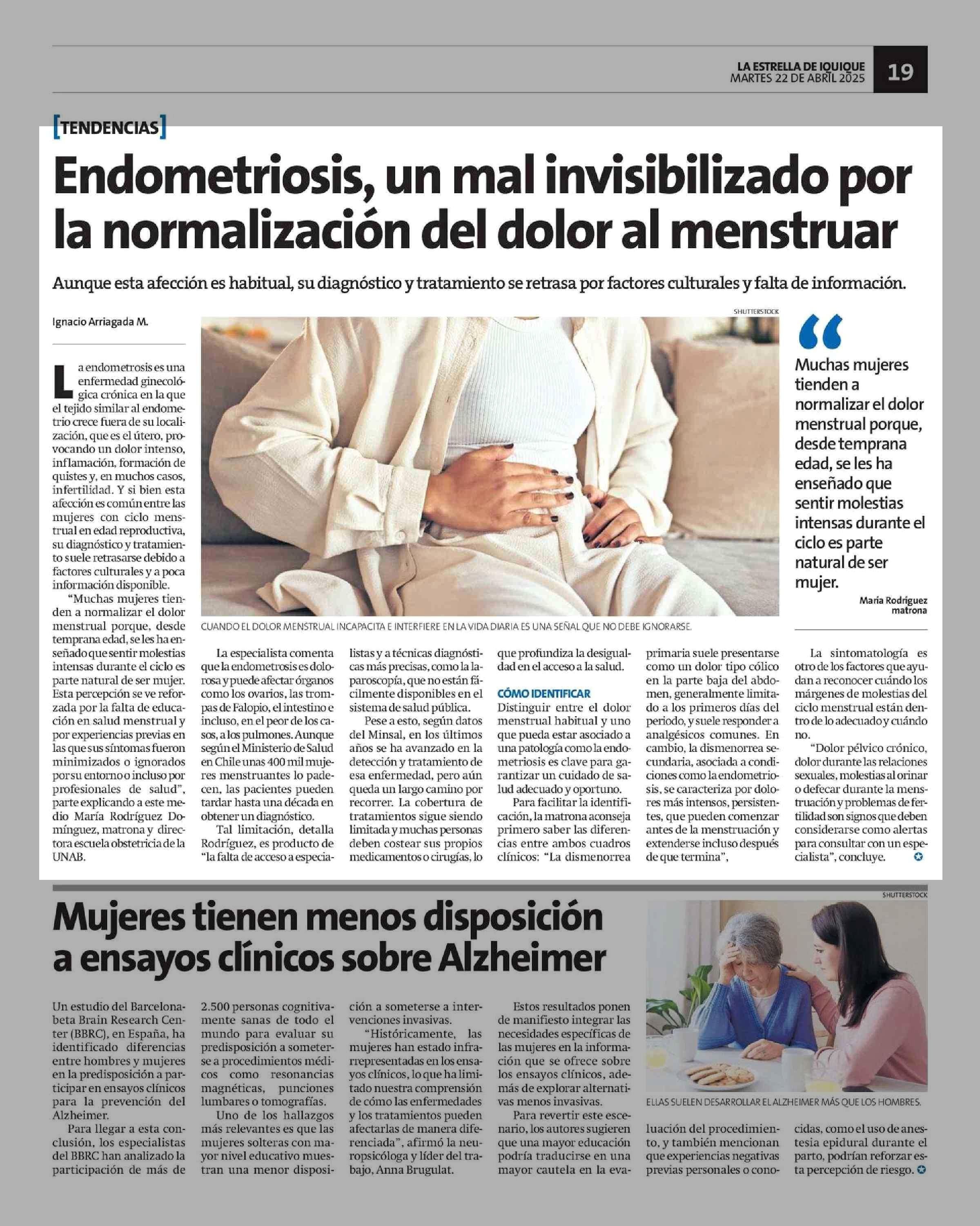 Endometriosis, un mal invisibilizado por la normalización del dolor al menstruar 22-04-2025 La Estrella de Iquique |