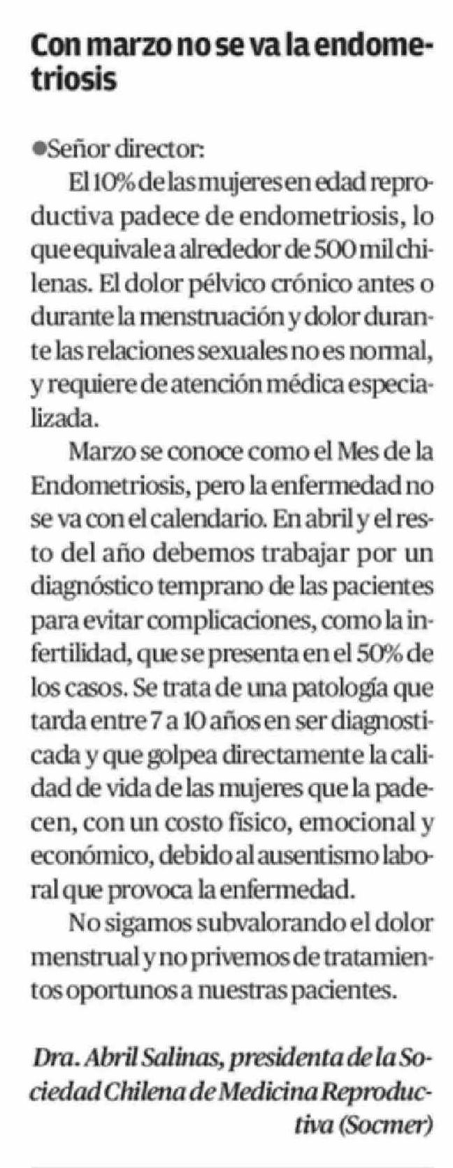| Título: | Cartas: Con marzo no se va la endometriosis |