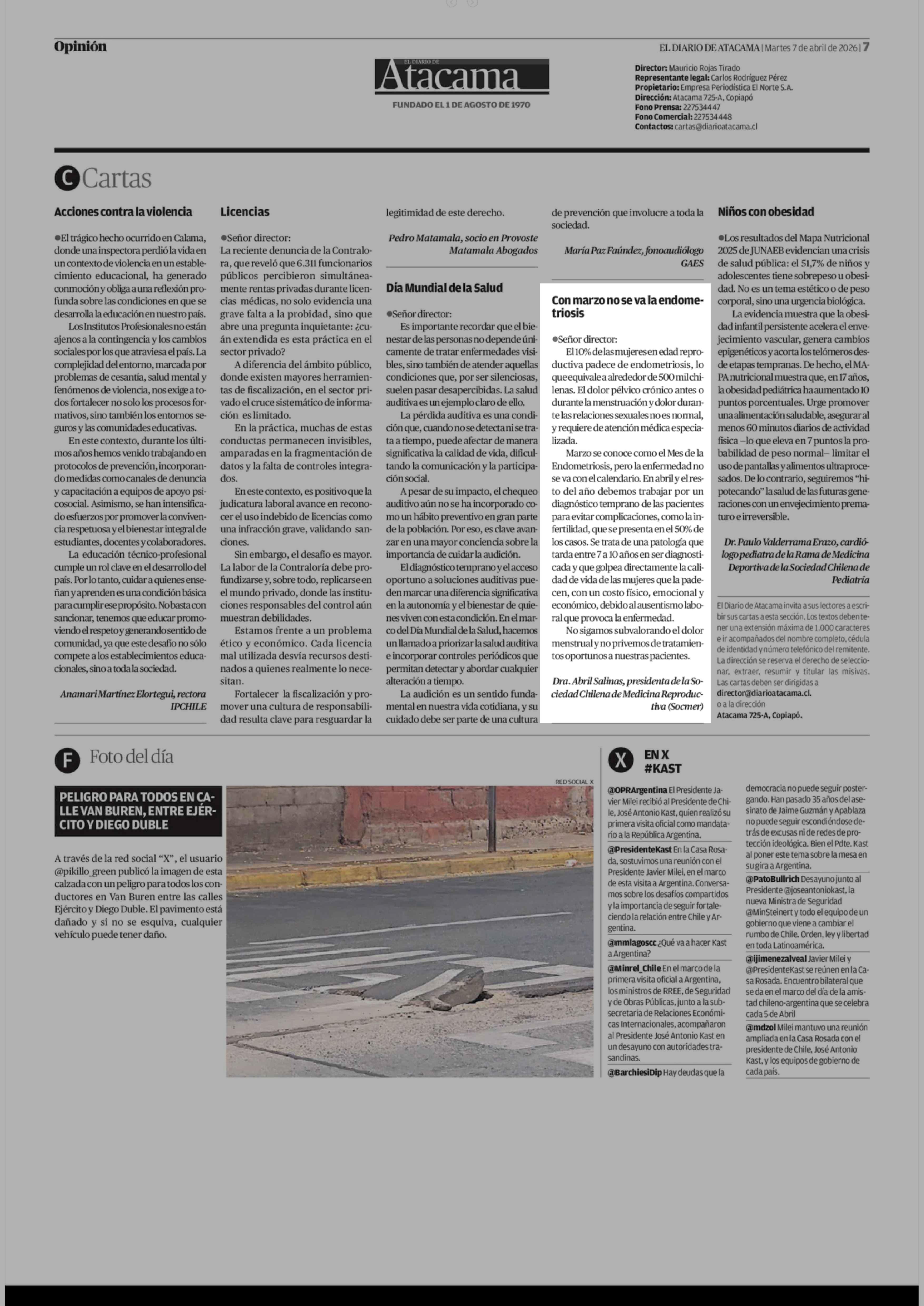 Cartas: Con marzo no se va la endometriosis 07-04-2026 El Diario de Atacama |