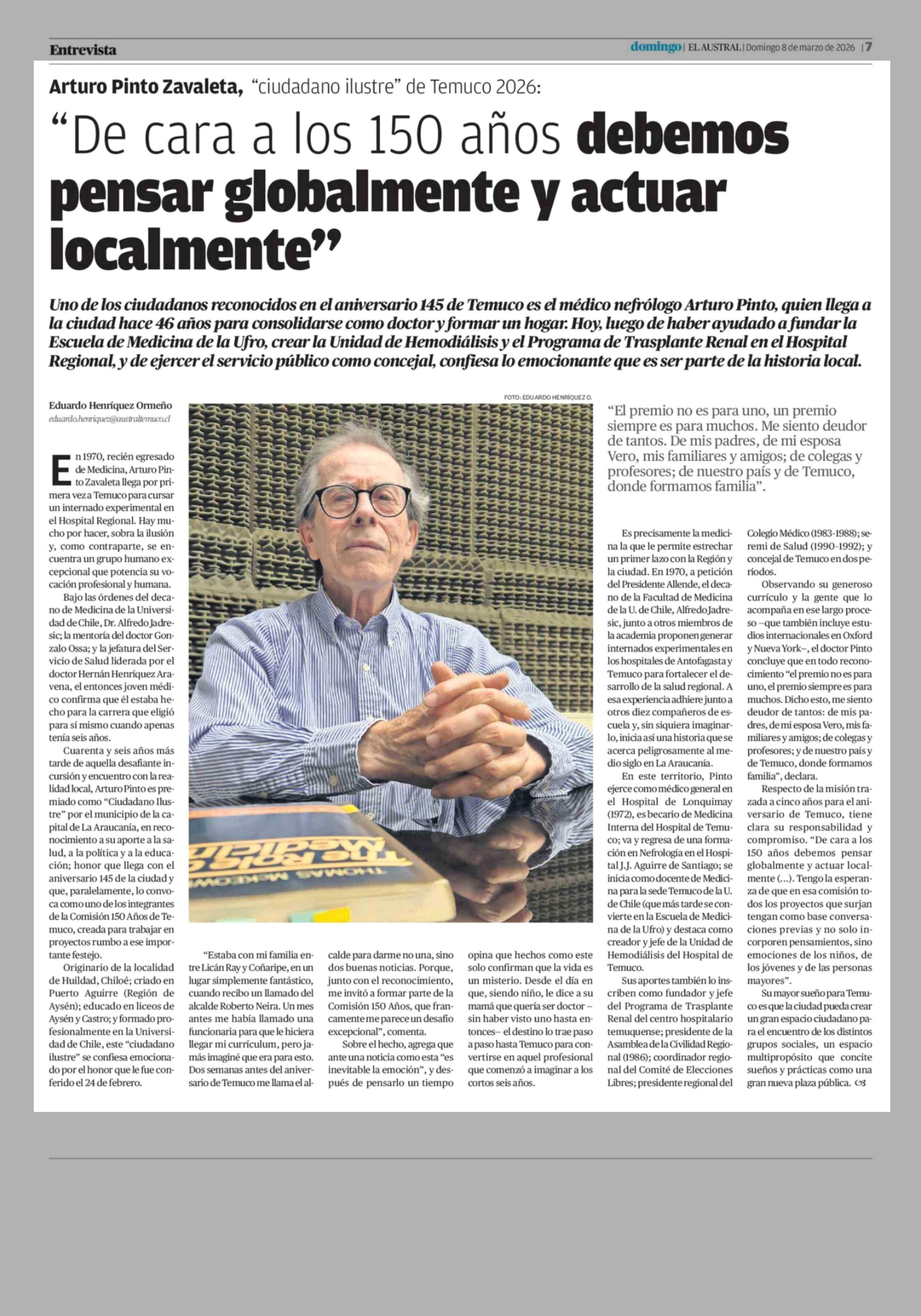 "De cara a los 150 años debemos pensar globalmente y actuar localmente" 08-03-2026 El Austral de la Araucanía |