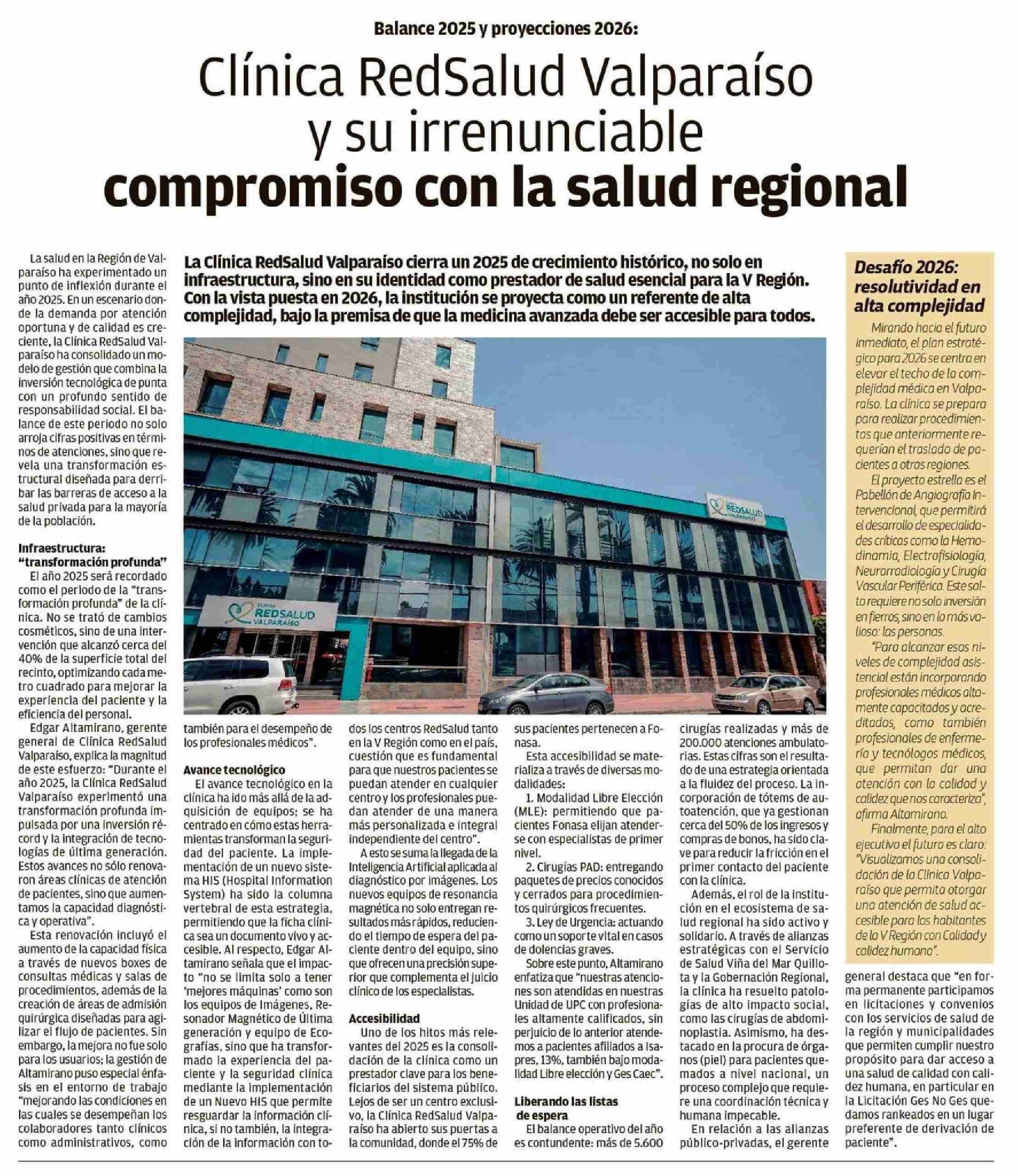Clínica RedSalud Valparaíso y su irrenunciable compromiso con la salud regional 25-01-2026 El Mercurio de Valparaíso |