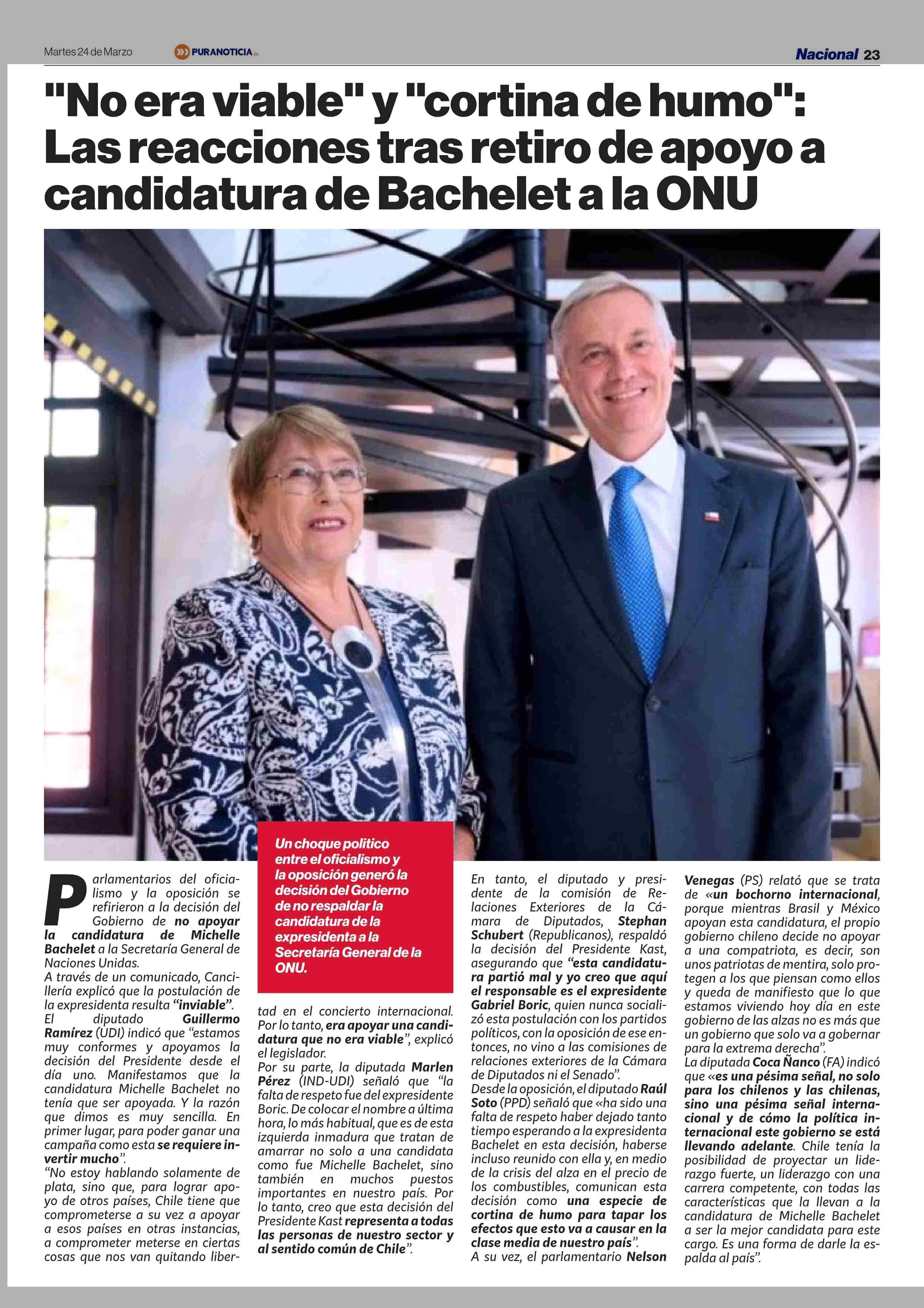 "No era viable” y "cortina de humo”: Las reacciones tras retiro de apoyo a candidatura de Bacheleta la ONU 24-03-2026 Puranoticia.cl |