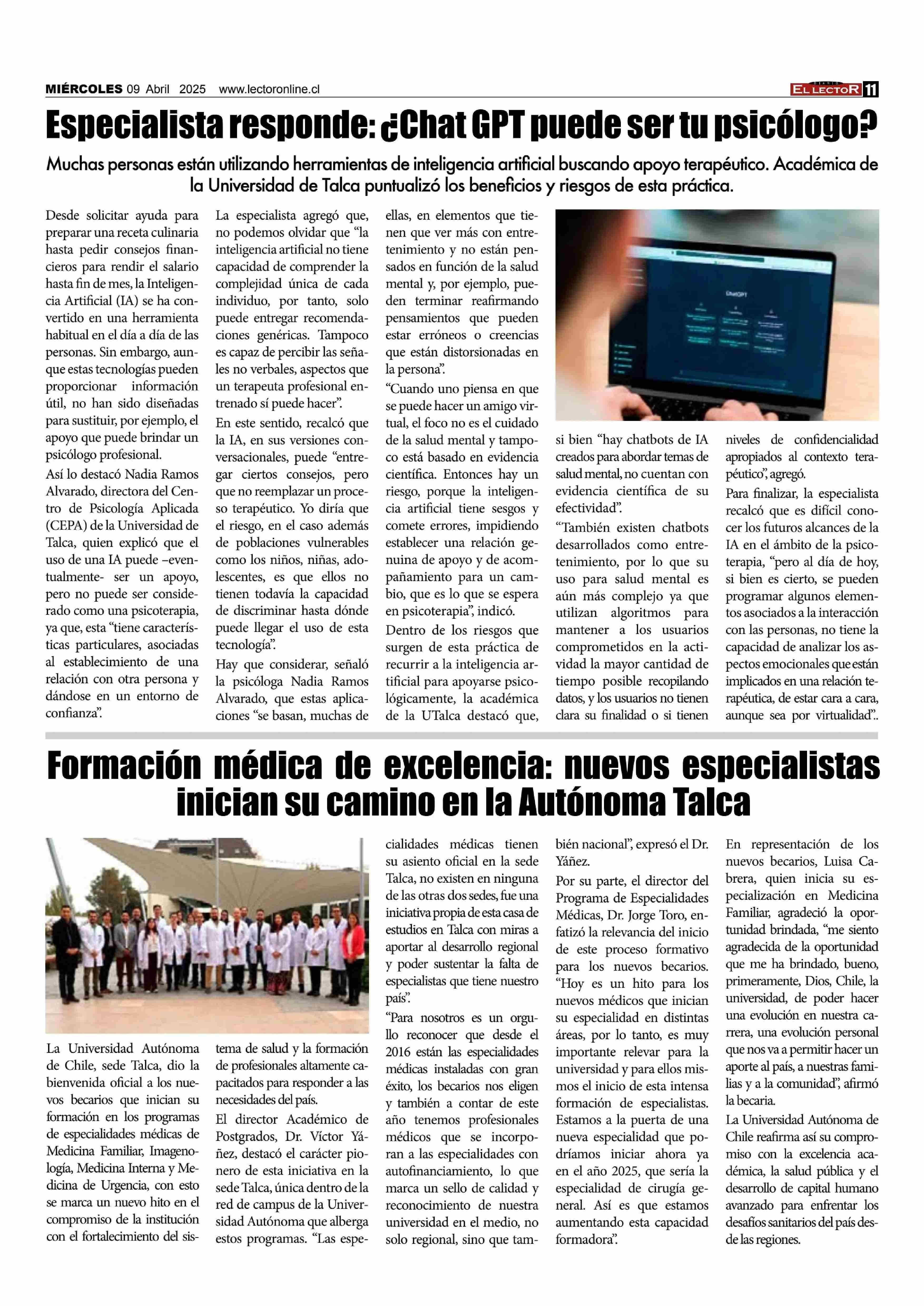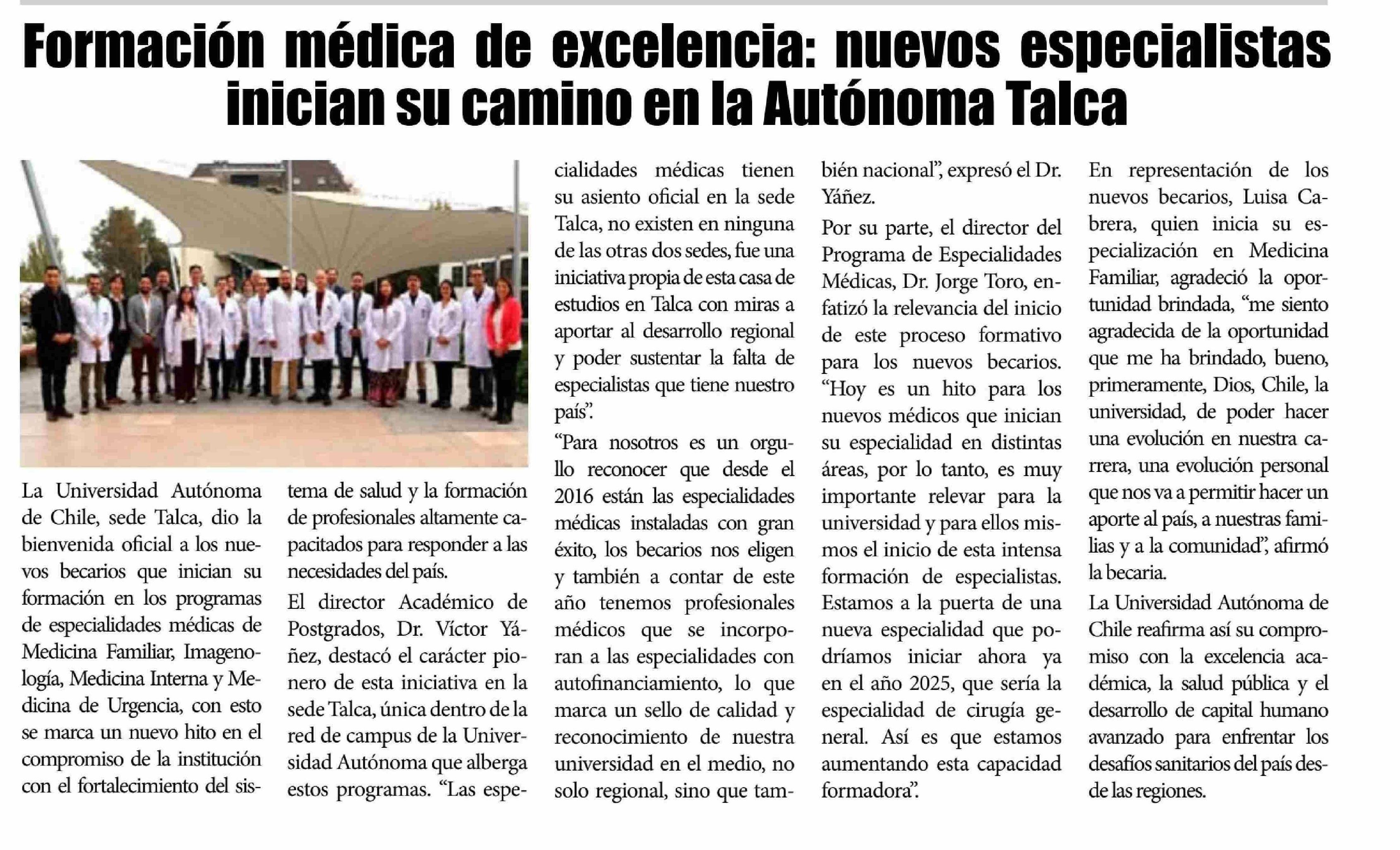 Formación médica de excelencia: nuevos especialistas inician su camino en la Autónoma Talca 09-04-2025 El Lector |