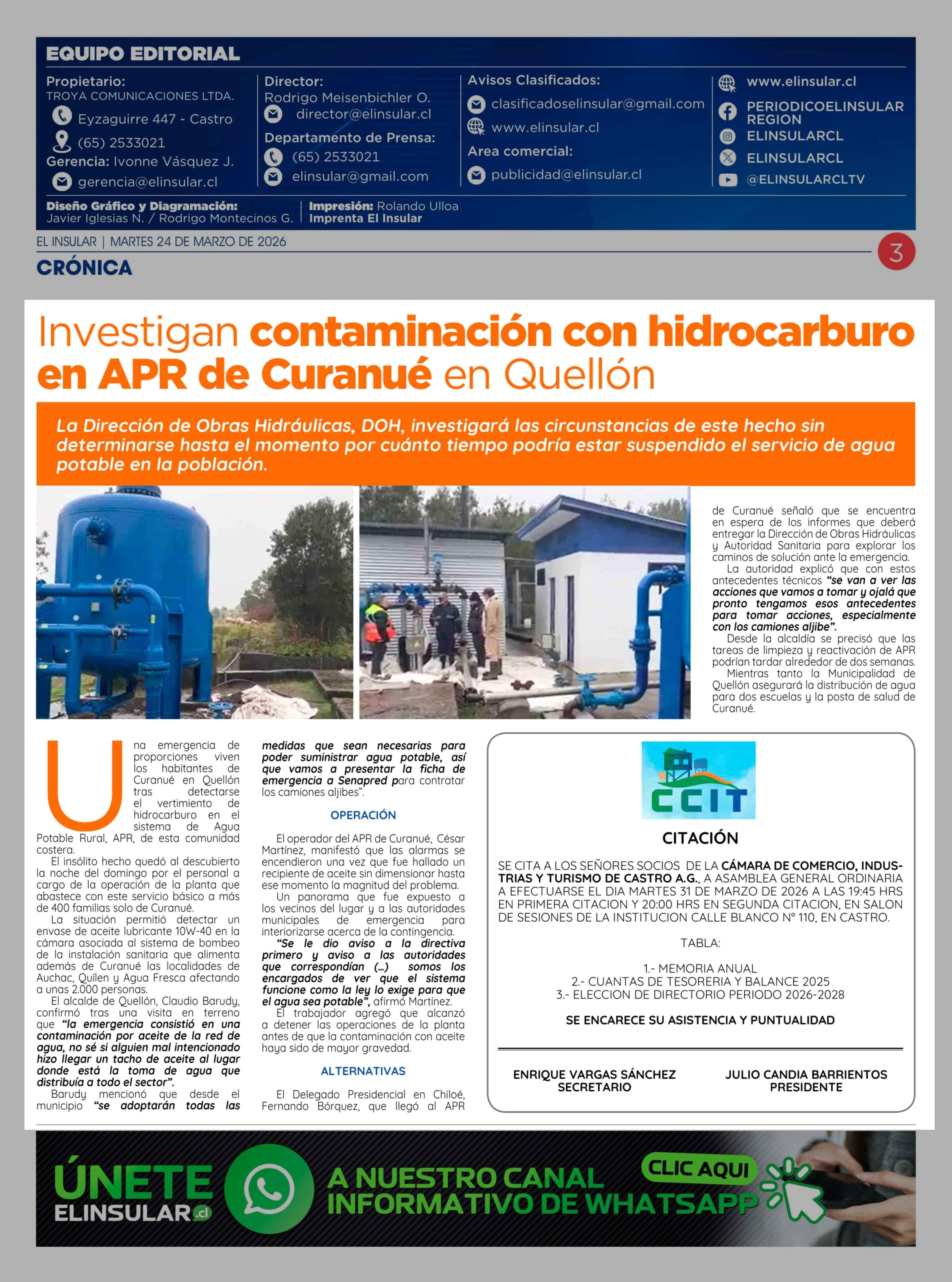 Investigan contaminación con hidrocarburo en APR de Curanue en Quellón 24-03-2026 El Insular |
