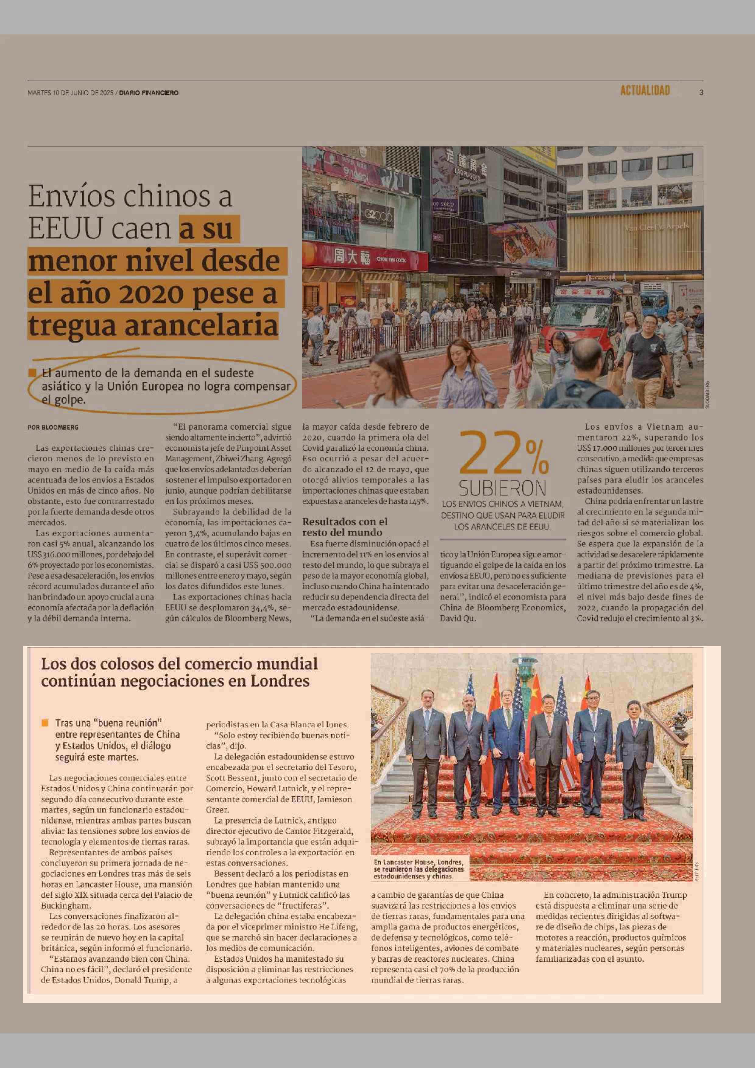 Los dos colosos del comercio mundial continúan negociaciones en Londres 10-06-2025 Diario Financiero |