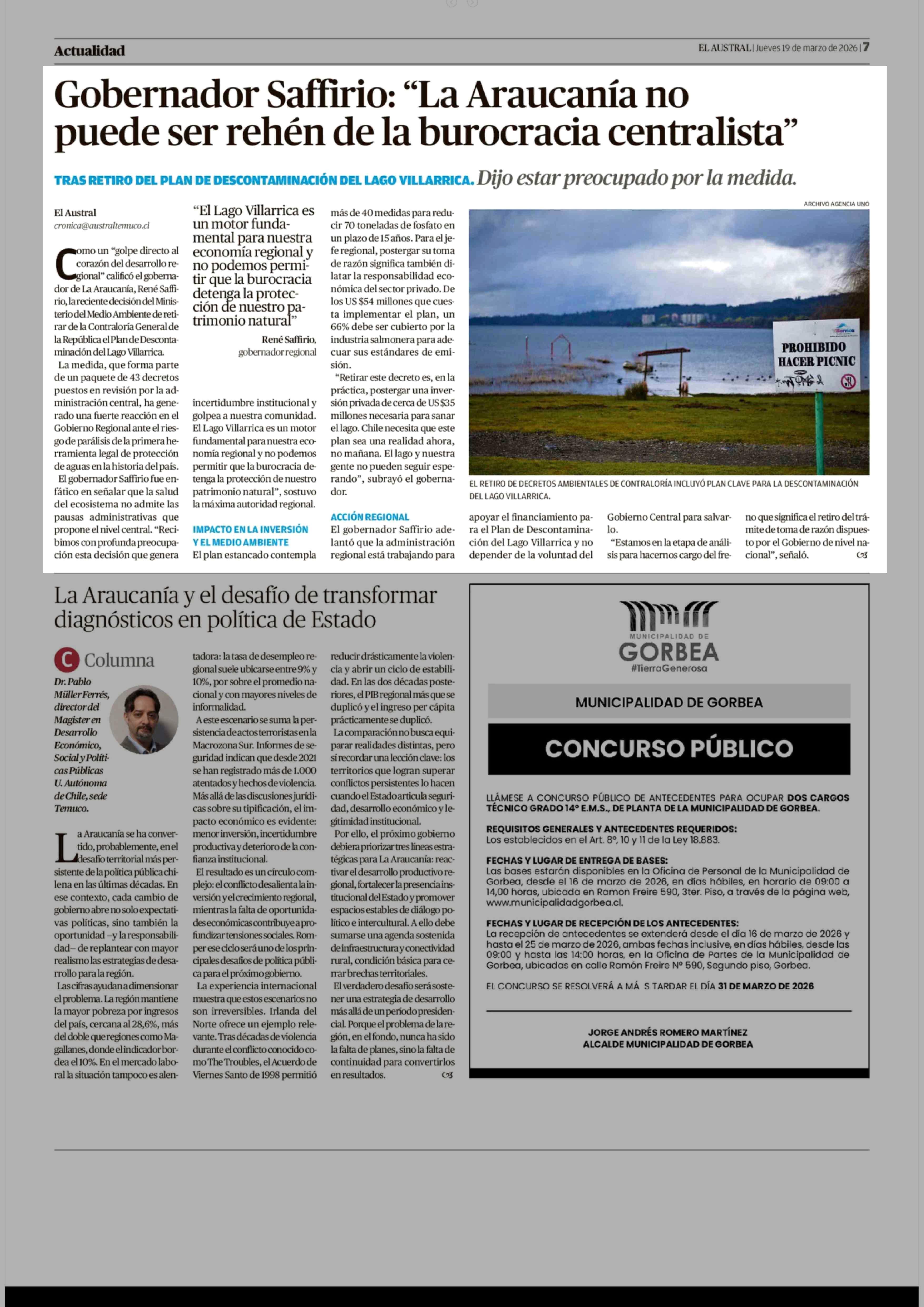 Gobernador Saffirio: "La Araucanía no puede ser rehén de la burocracia centralista" 19-03-2026 El Austral de la Araucanía |