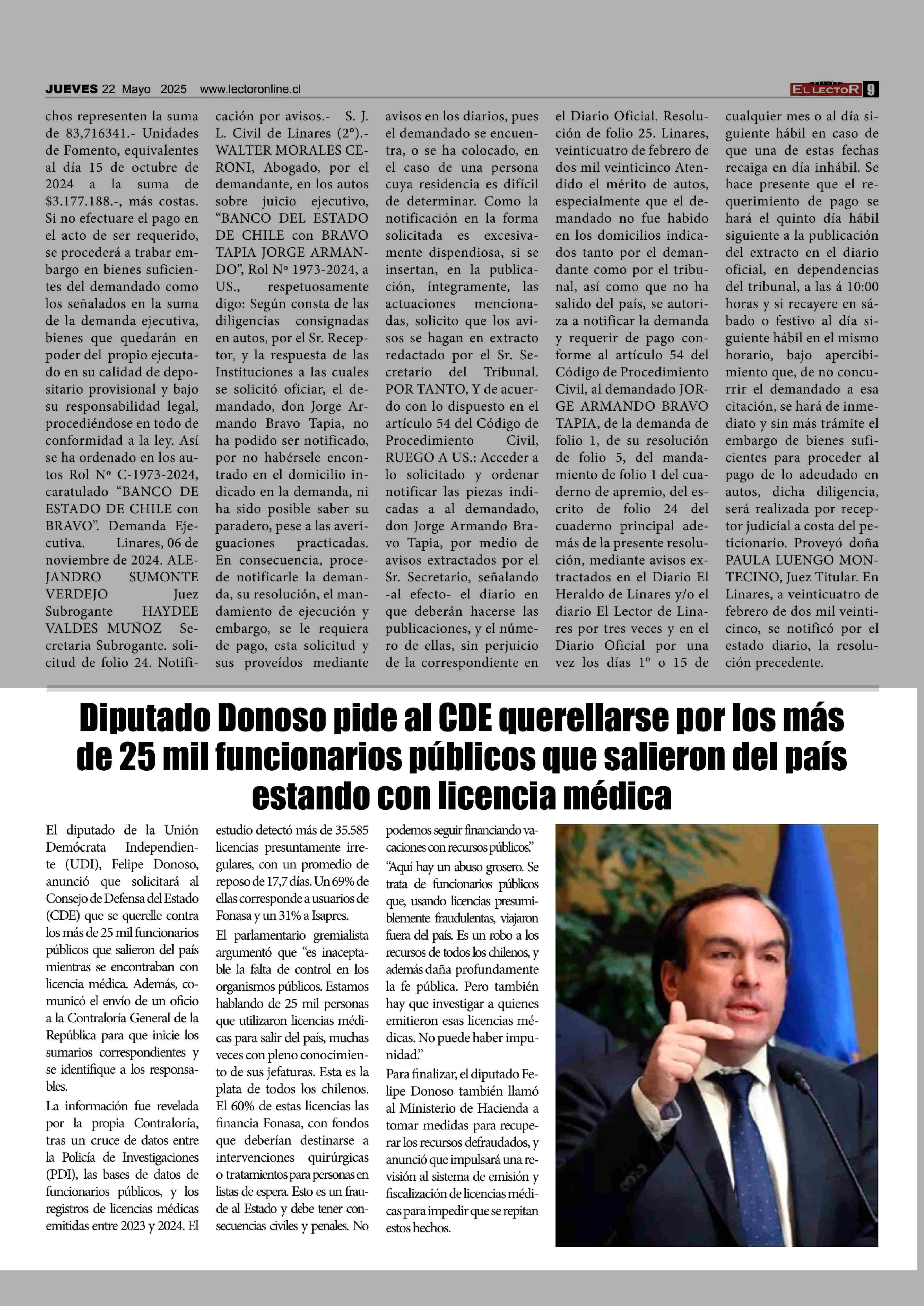 Diputado Donoso pide al CDE querellarse por los más de 23 mil funcionarios públicos que salieron del país estando con licencia médica 22-05-2025 El Lector |