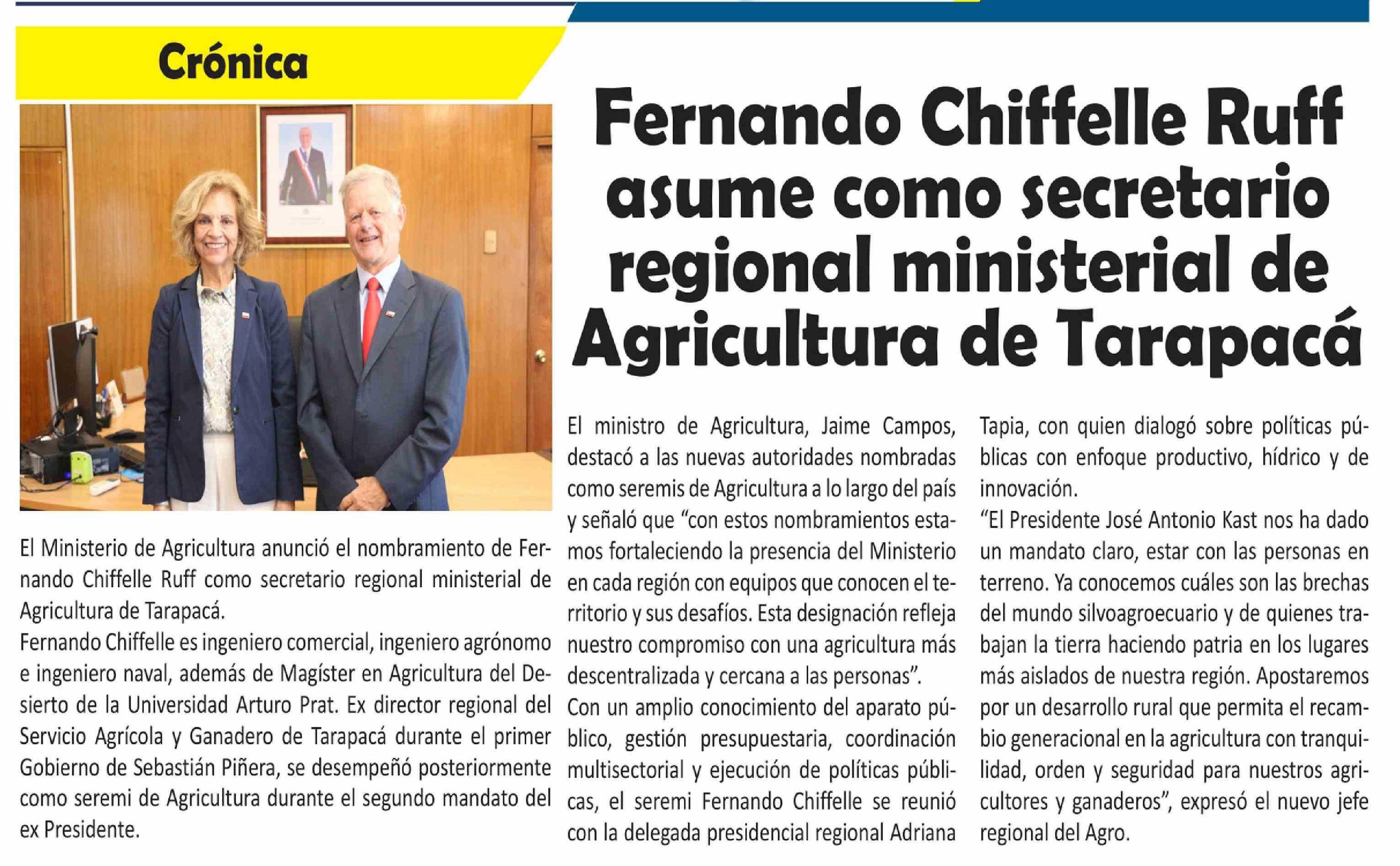 Fernando Chiffelle Ruff asume como secretario regional ministerial de Agricultura de Tarapacá 03-04-2026 El Longino |