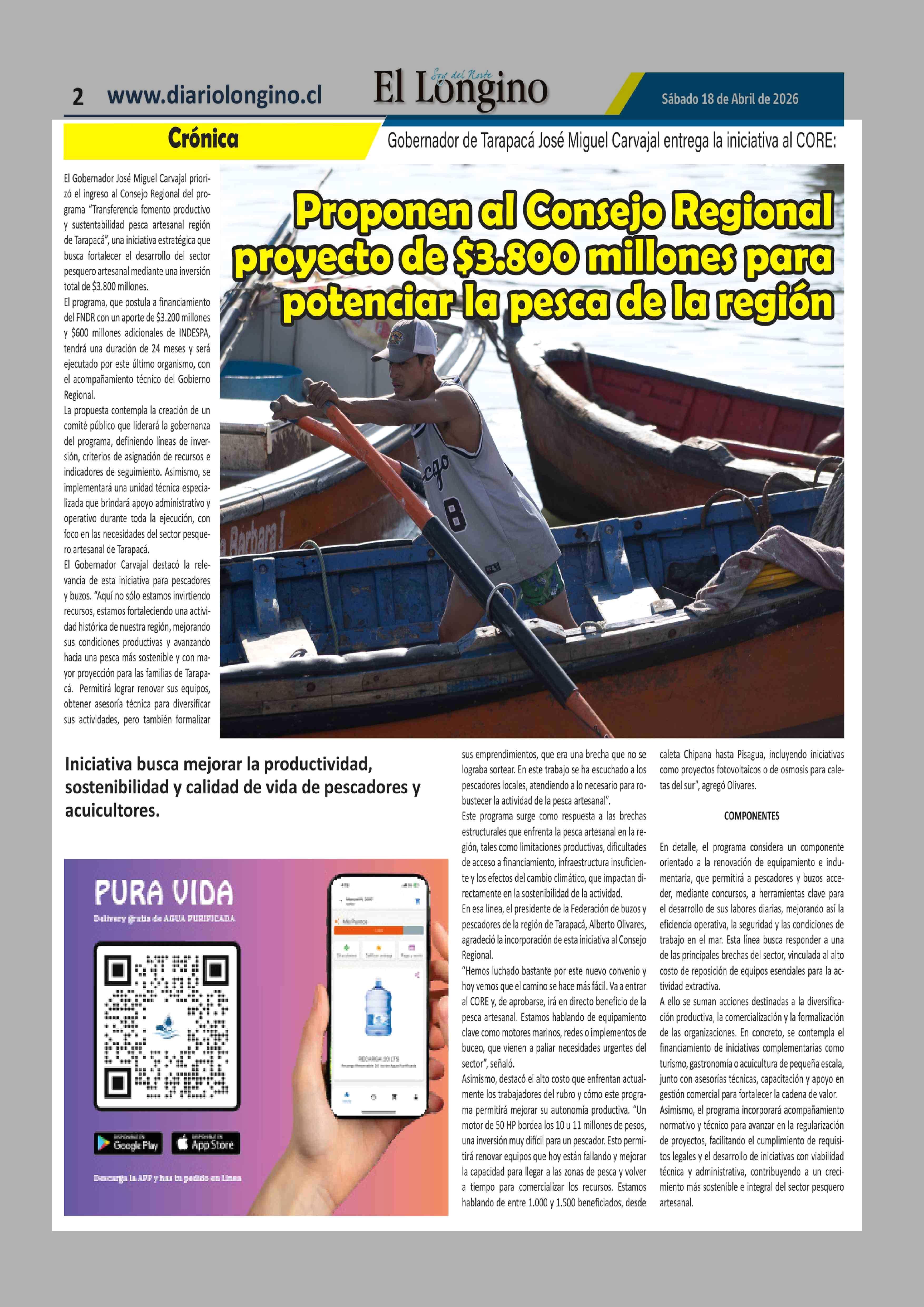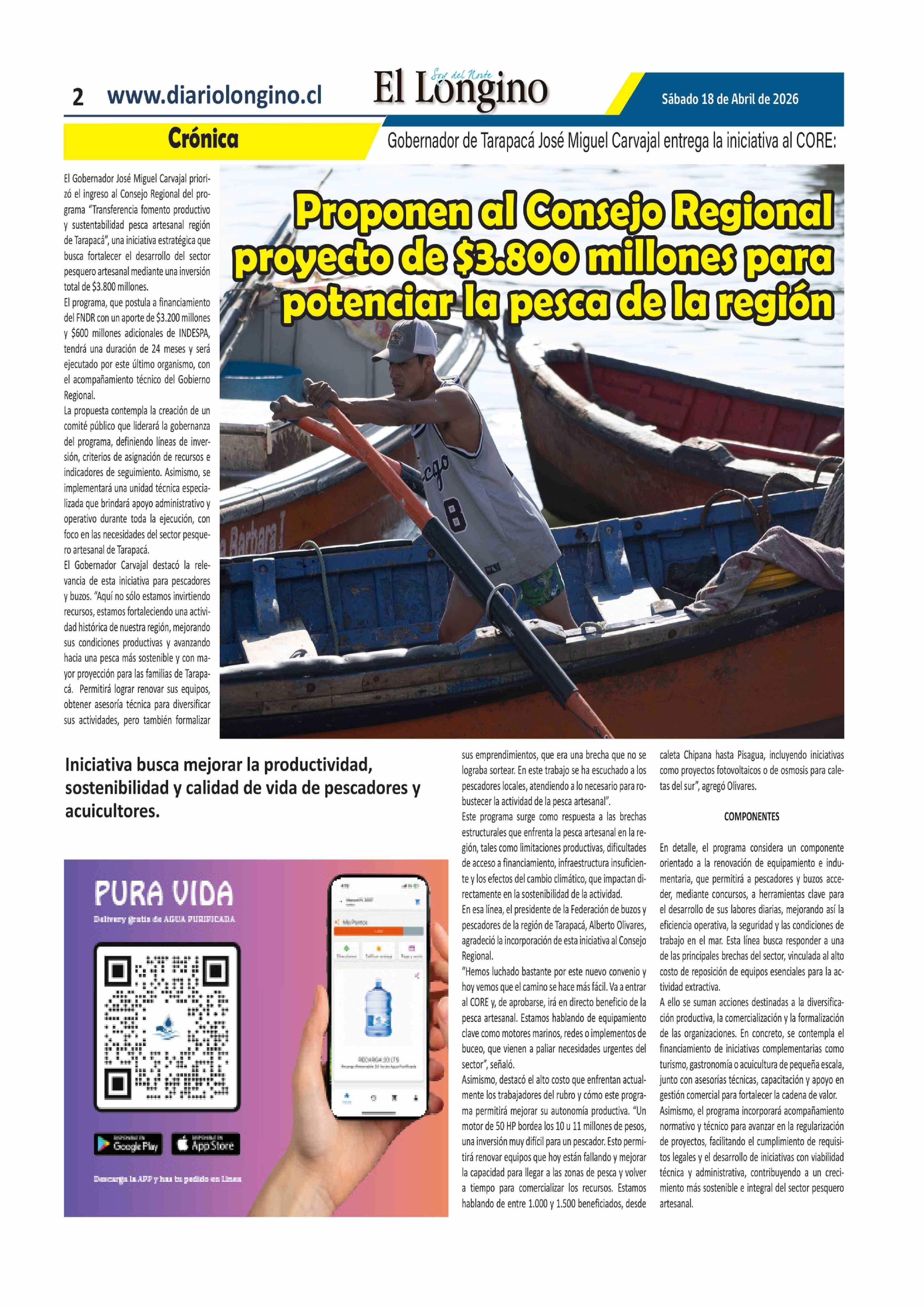 Proponen al Consejo Regional proyecto de $3.800 millones para potenciar la pesca de la región 18-04-2026 El Longino |