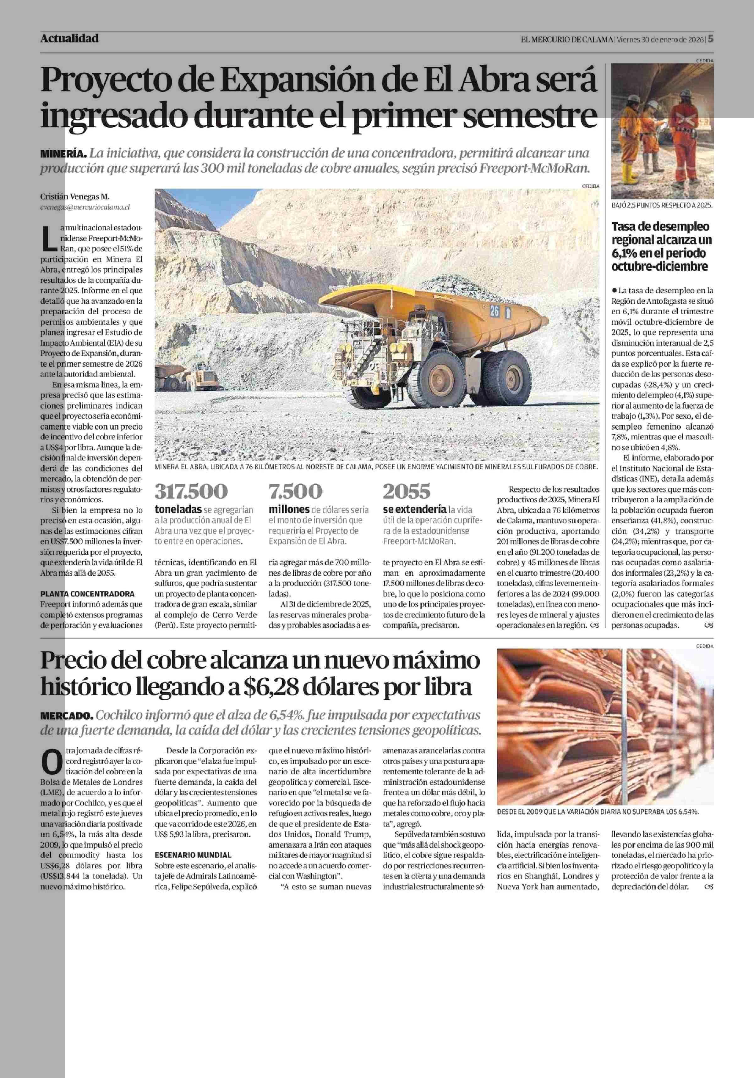 Proyecto de Expansión de El Abra será ingresado durante el primer semestre 30-01-2026 El Mercurio de Calama |