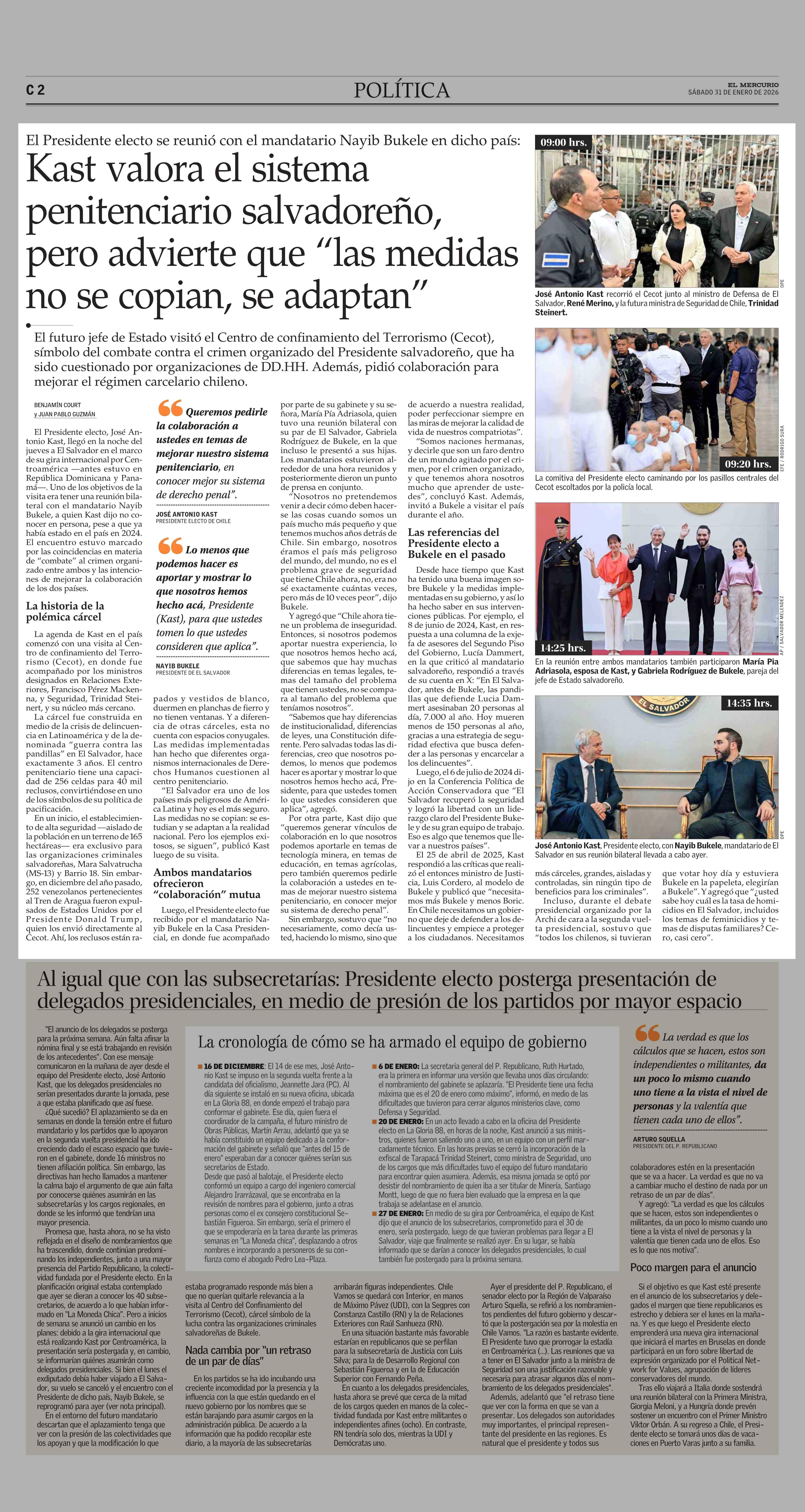 Kast valora el sistema penitenciario salvadoreño, pero advierte que “las medidas no se copian, se adaptan” 31-01-2026 El Mercurio |