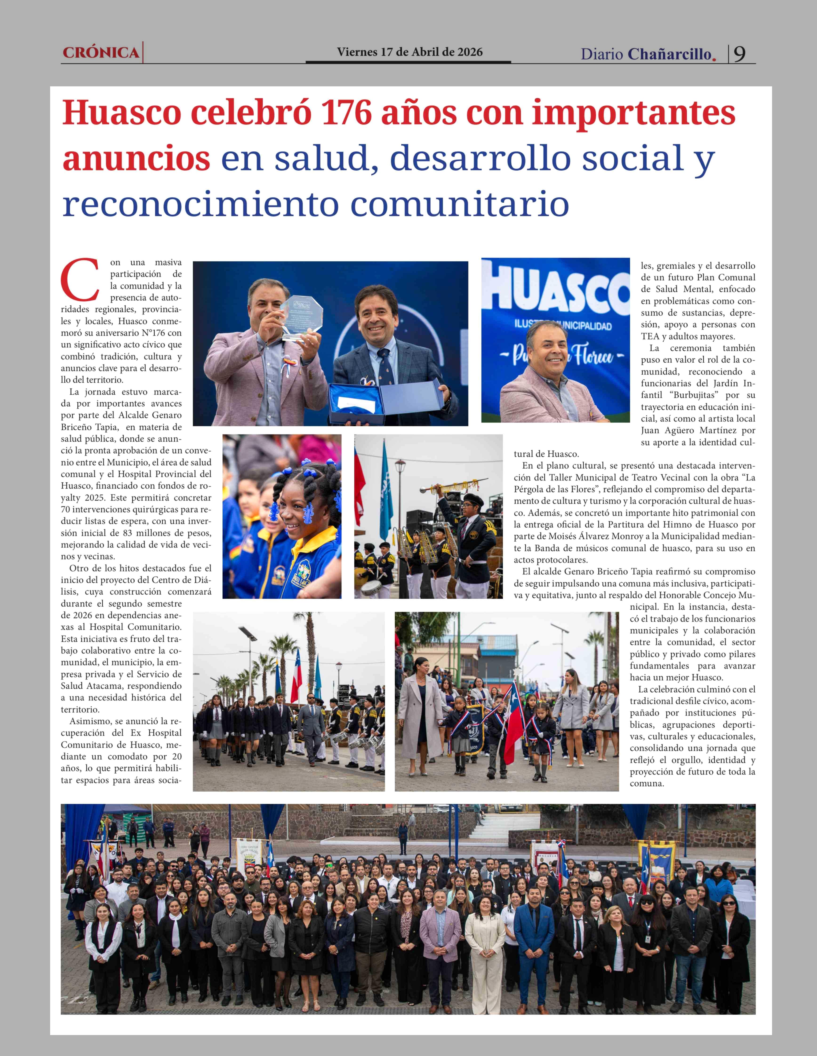 Huasco celebró 176 años con importantes anuncios en salud, desarrollo social y reconocimiento comunitario 17-04-2026 Diario Chañarcillo |