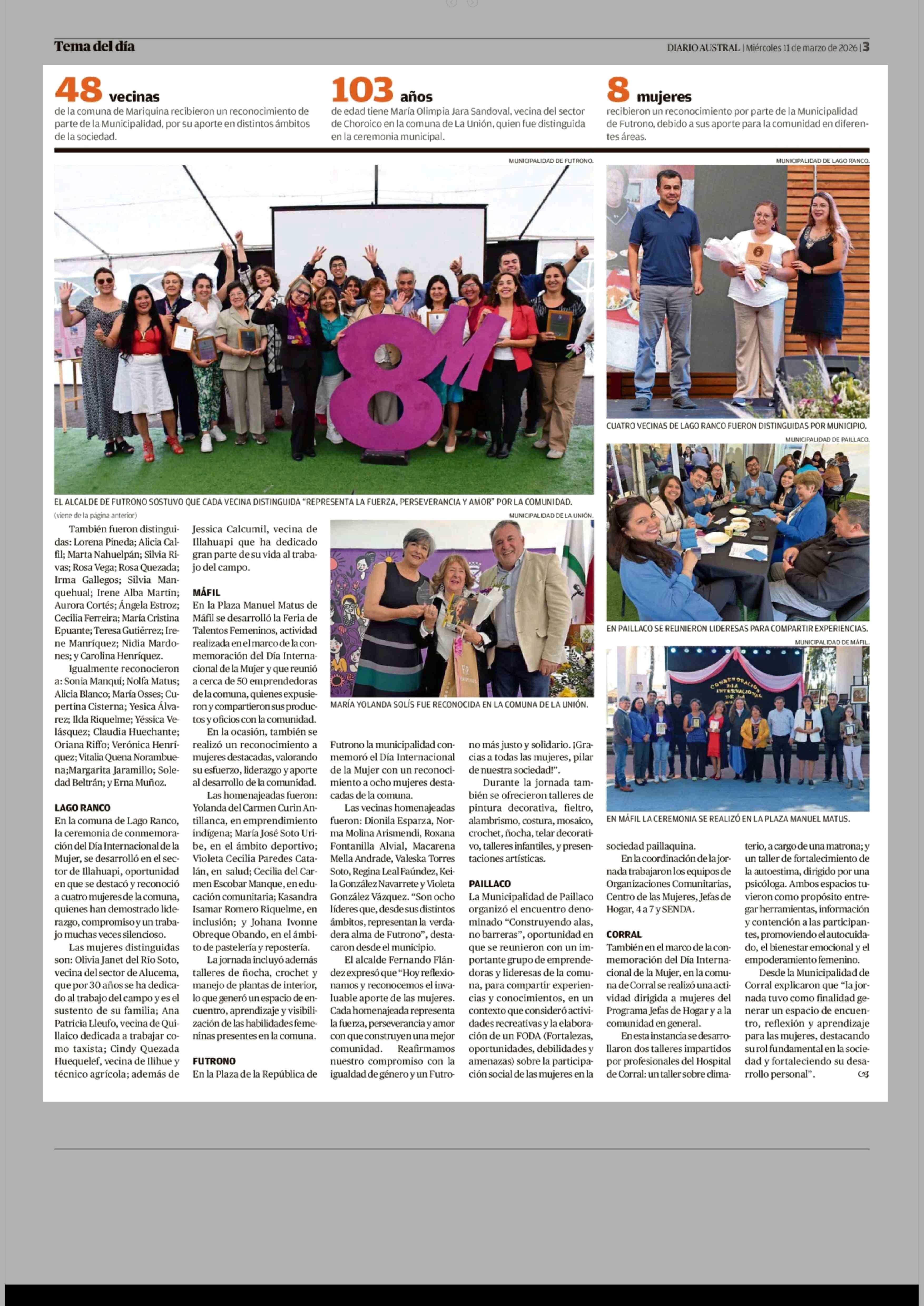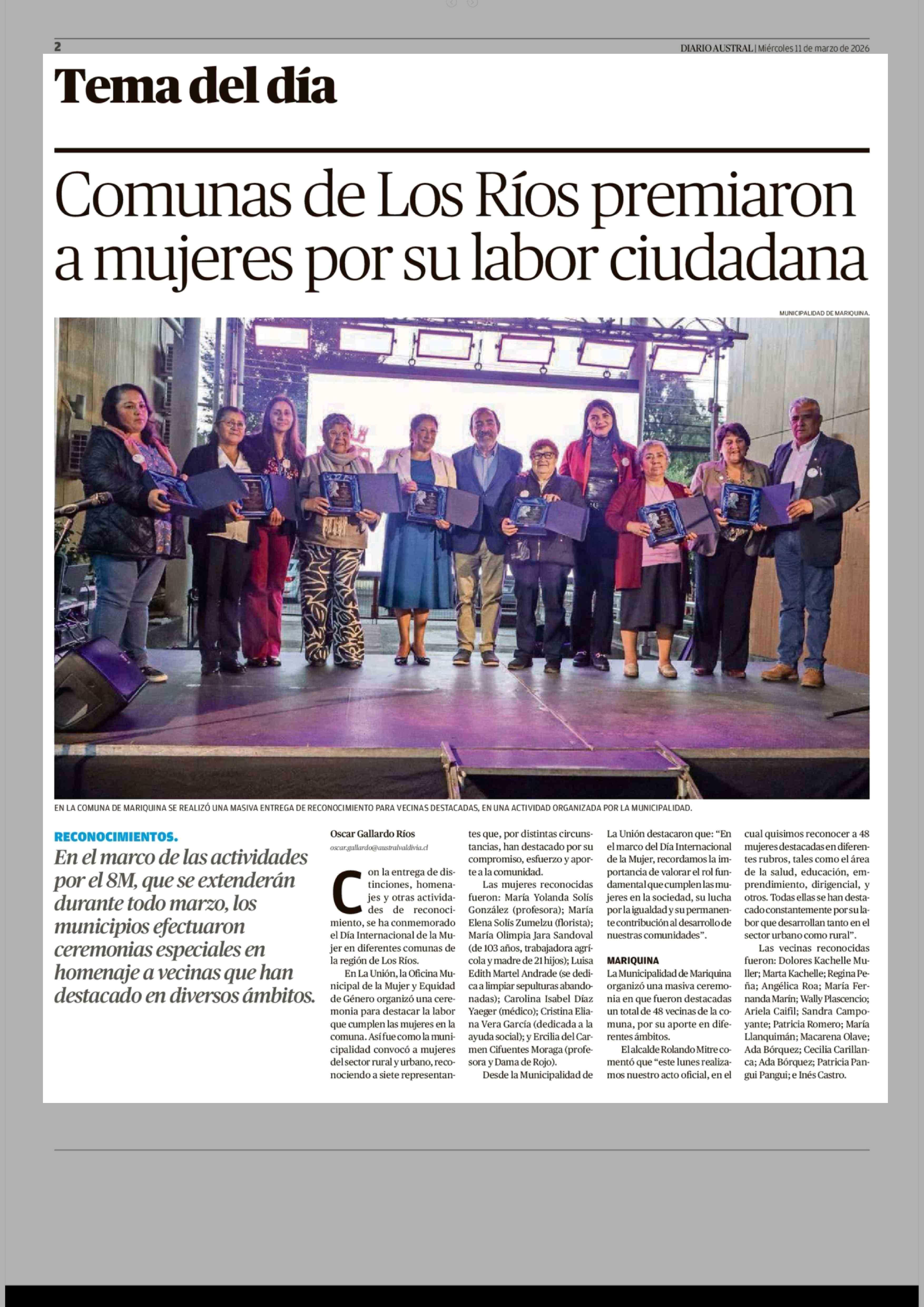 Comunas de Los Ríos premiaron a mujeres por su labor ciudadana 11-03-2026 Diario Austral Región de Los Ríos |