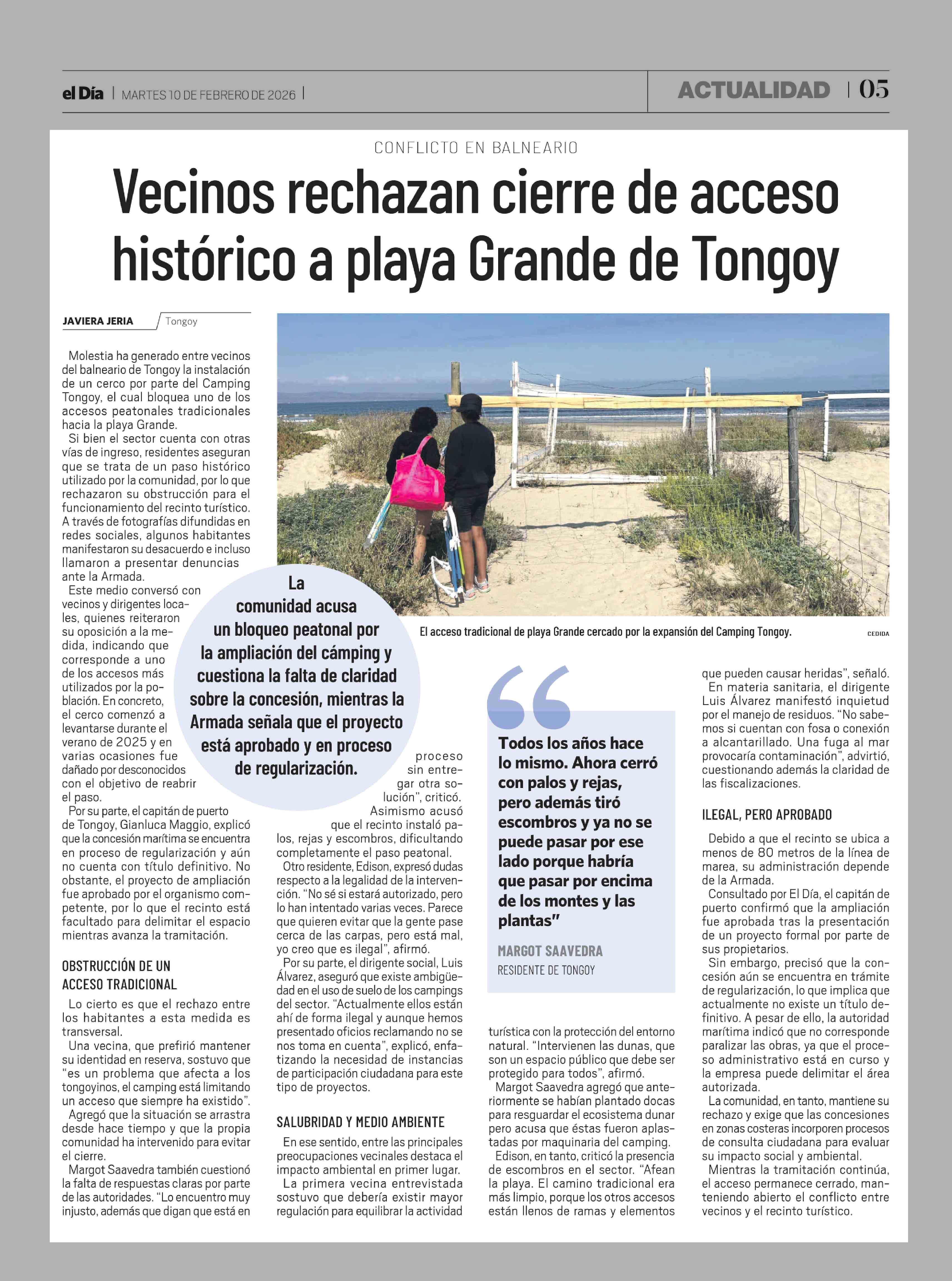 Vecinos rechazan cierre de acceso histórico a playa Grande de Tongoy 10-02-2026 El Día |
