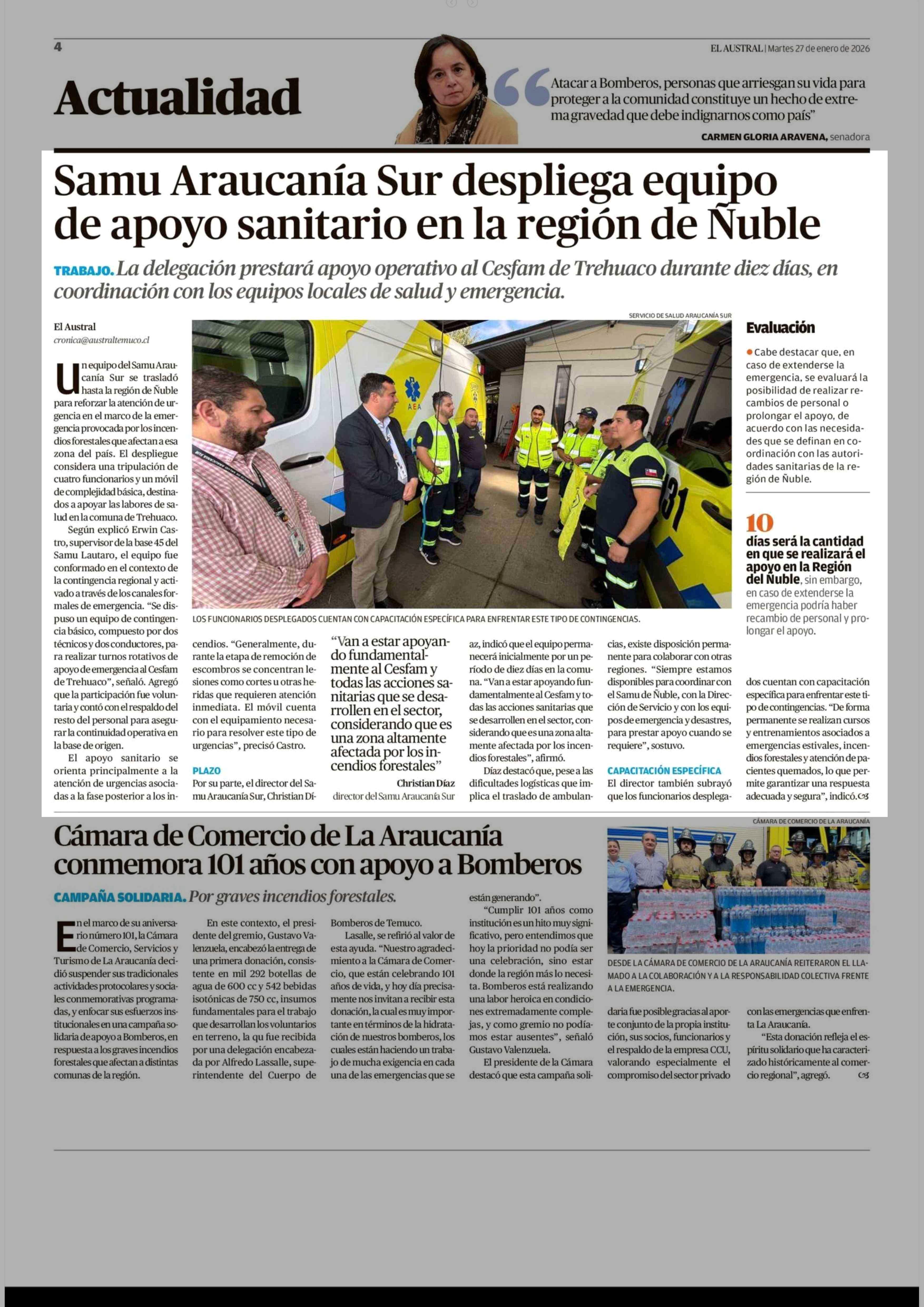 Samu Araucanía Sur despliega equipo de apoyo sanitario en la región de Nuble 27-01-2026 El Austral de la Araucanía |