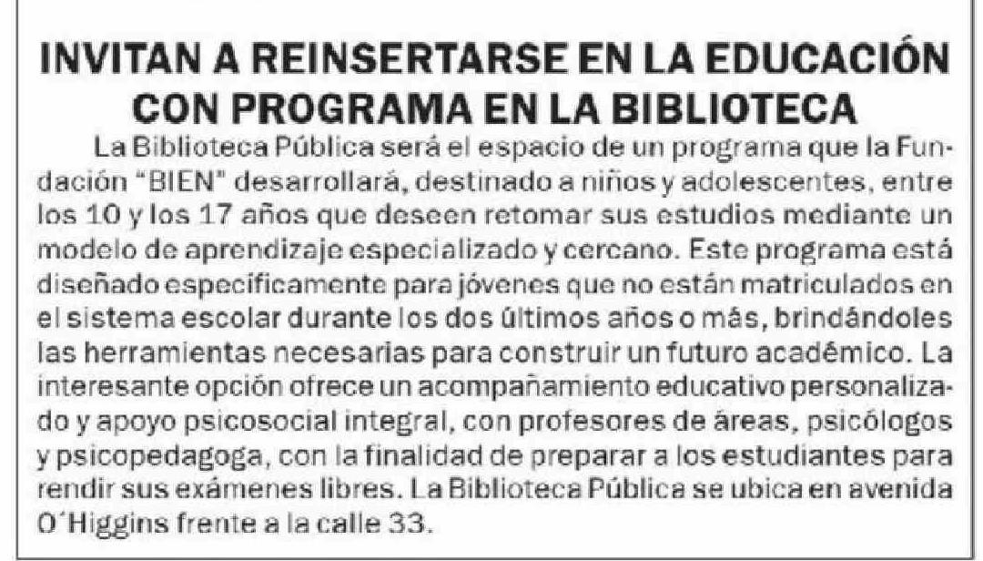 | Título: | INVITAN A REINSERTARSE EN LA EDUCACIÓN CON PROGRAMA EN LA BIBLIOTECA La Biblioteca Pública será el espacio de un programa que la Fun- |