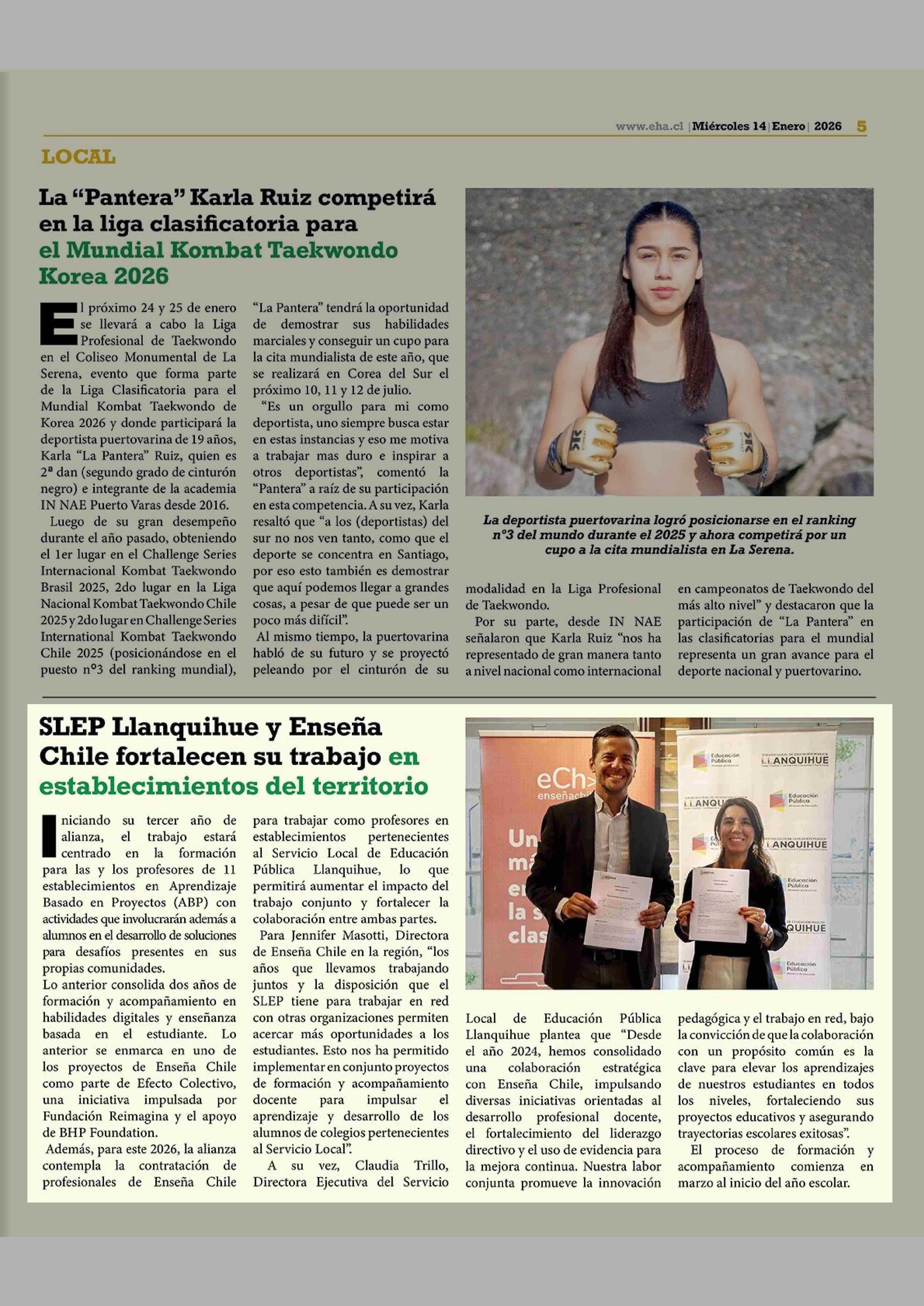 SLEP Llanquihue y Enseña Chile fortalecen su trabajo en establecimientos del territorio 14-01-2026 El Heraldo Austral |