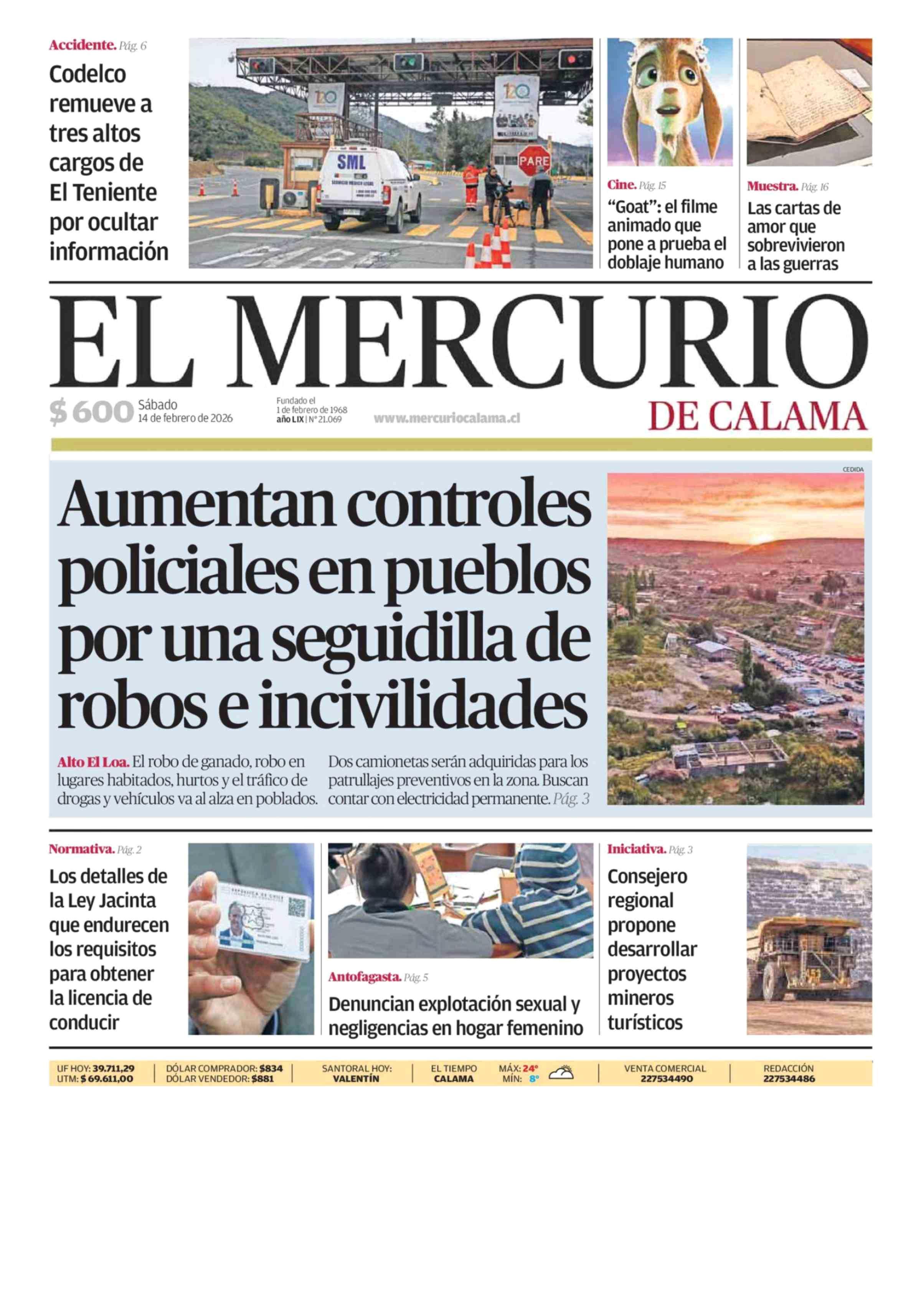 PORTADA EL MERCURIO DE CALAMA CHILE 14-02-2026 El Mercurio de Calama |