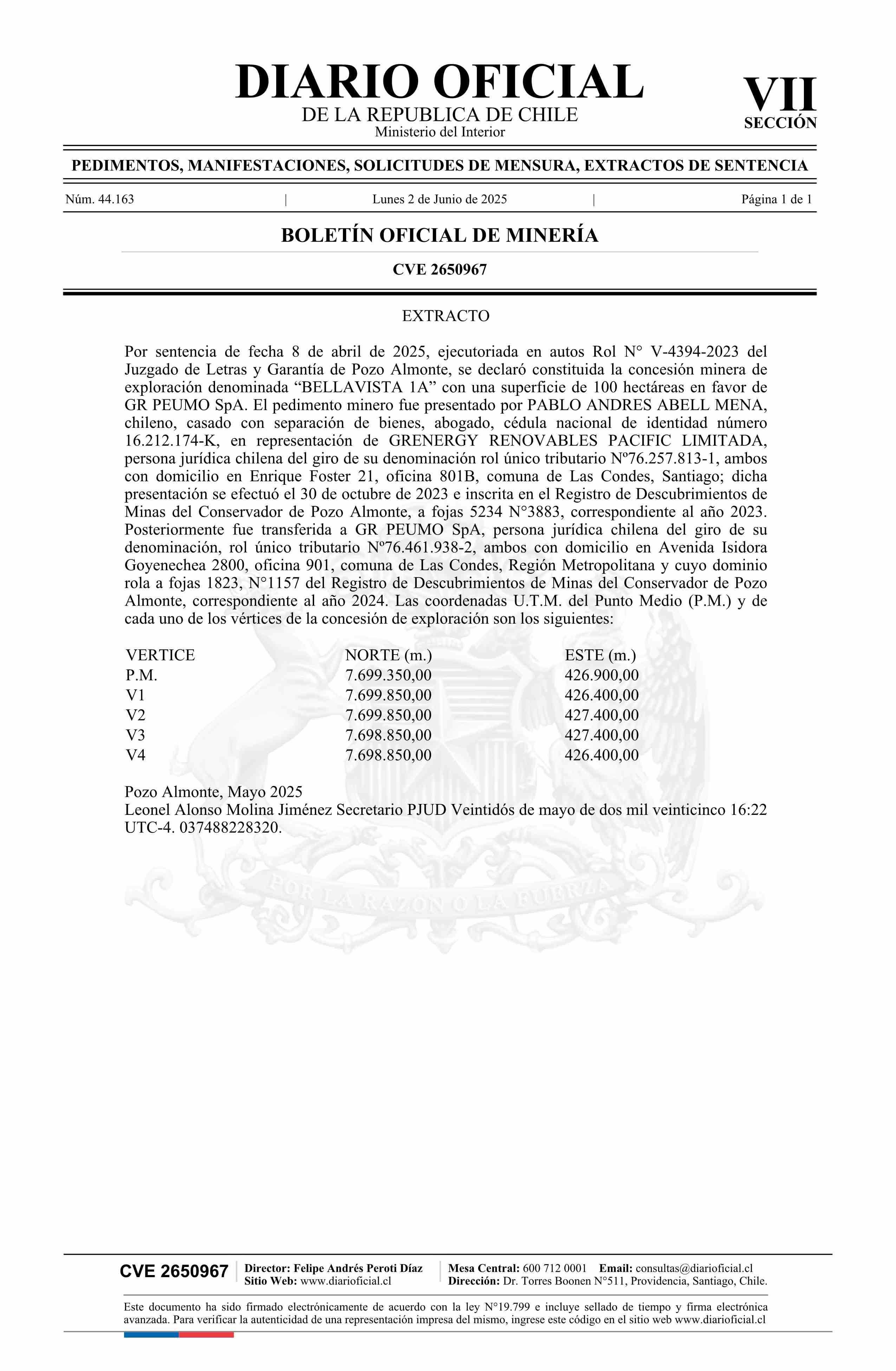 BELLAVISTA 1A / GR Peumo SpA 02-06-2025 DIARIO OFICIAL CHILE - BOLETÍN OFICIAL DE MINERÍA |