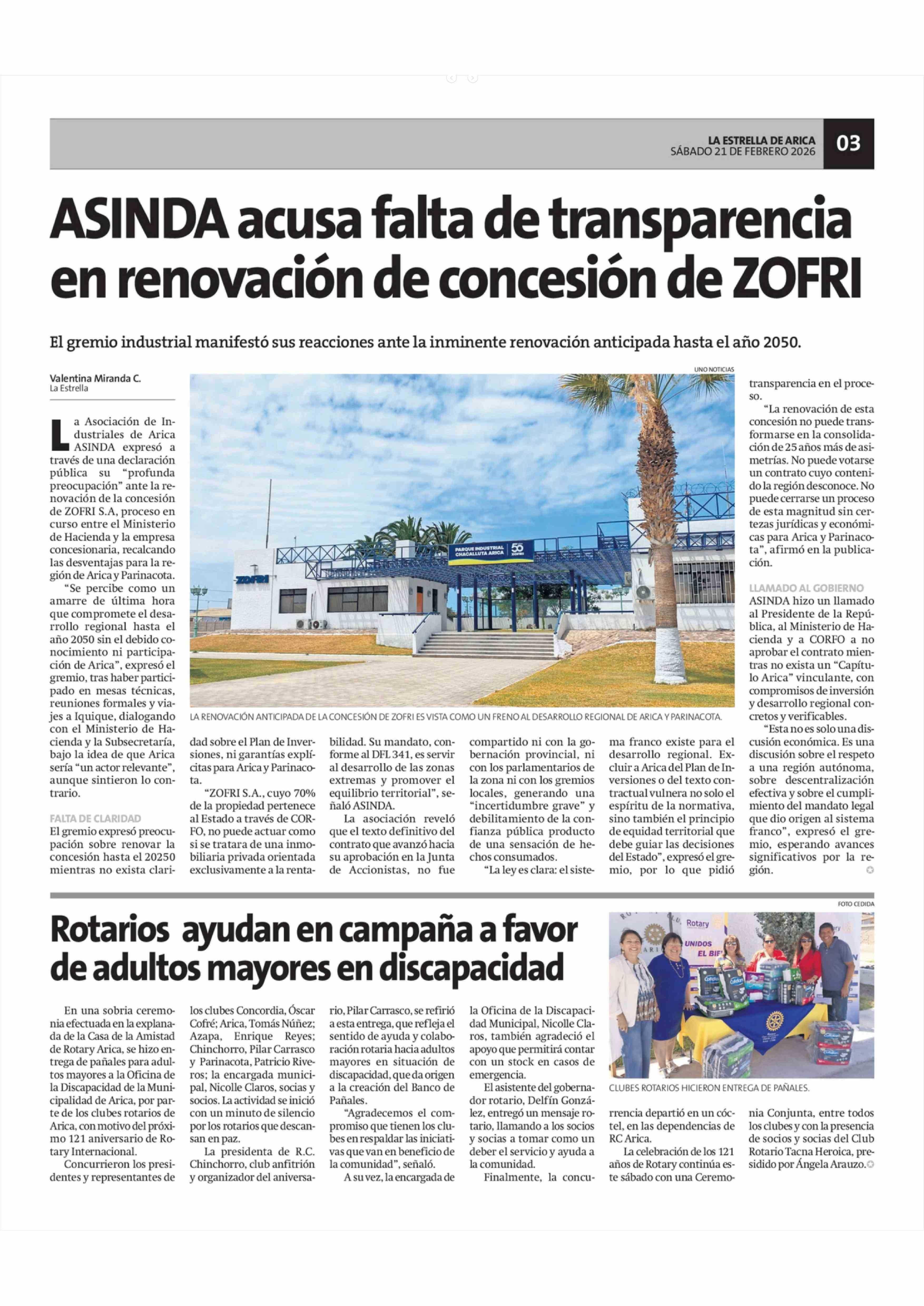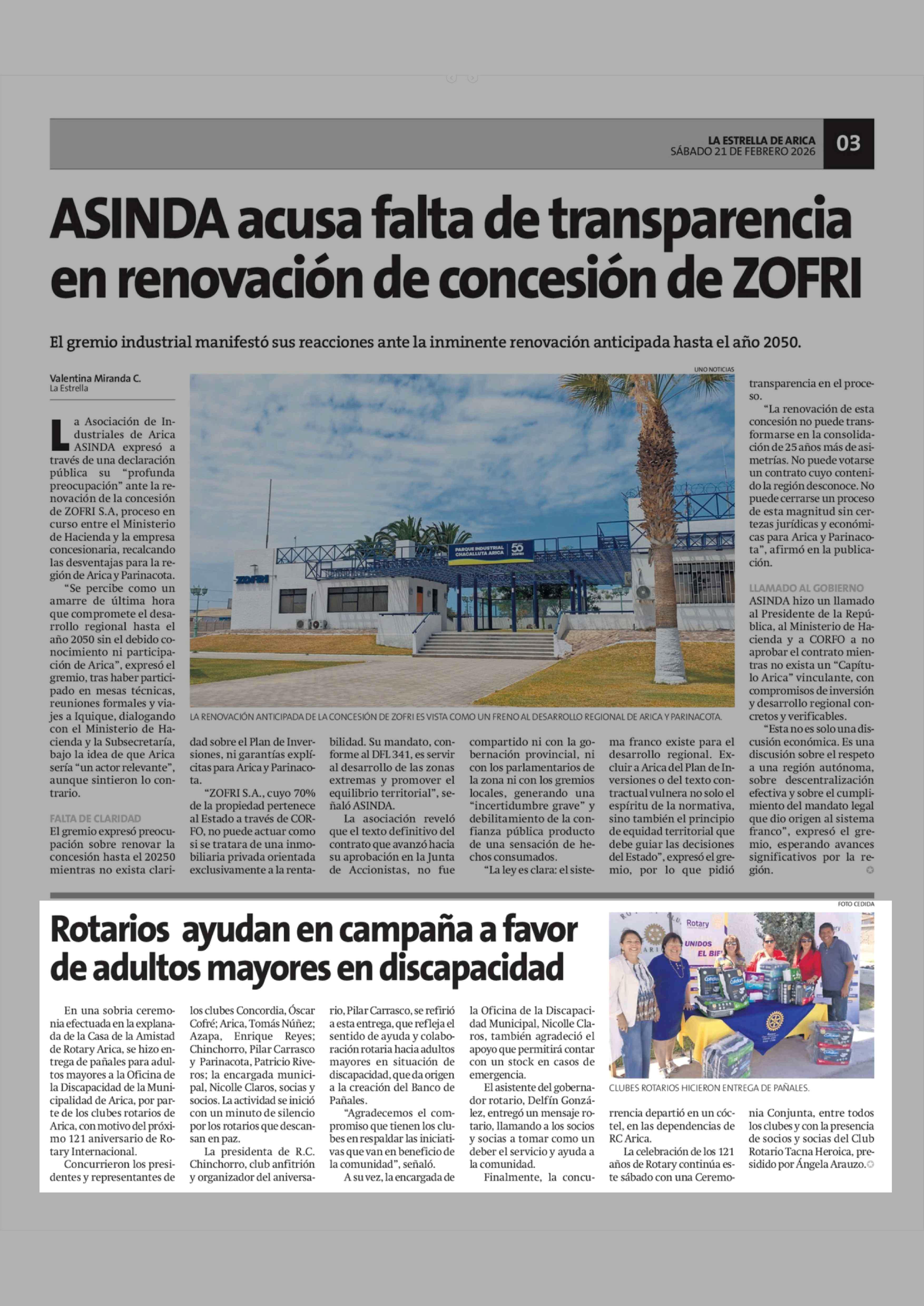 Rotarios ayudan en campaña a favor de adultos mayores en discapacidad 21-02-2026 La Estrella de Arica |