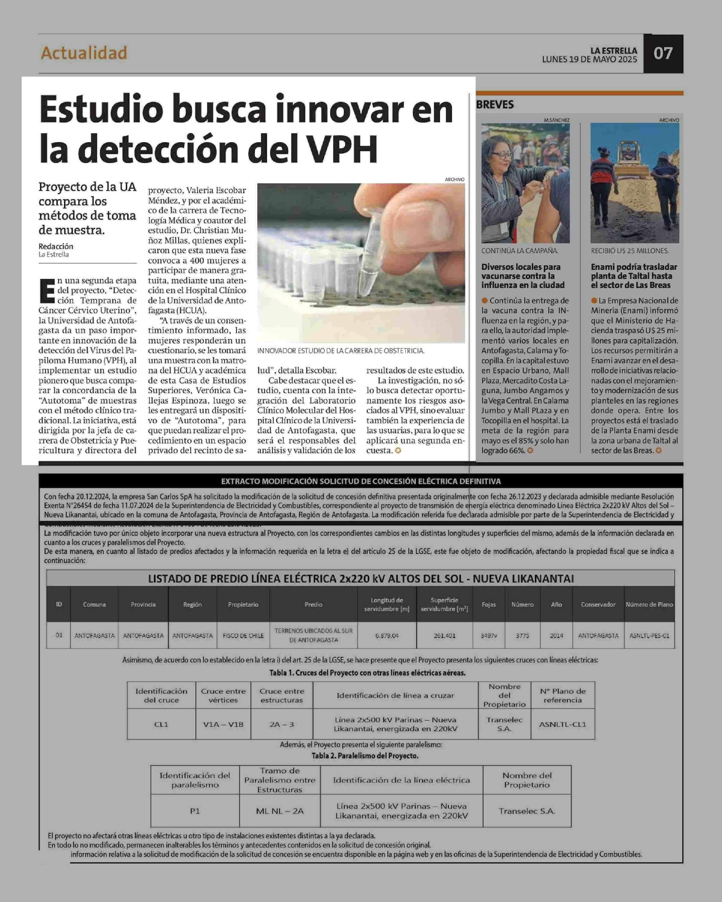 Estudio busca innovar en la detección del VPH 19-05-2025 La Estrella de Antofagasta |