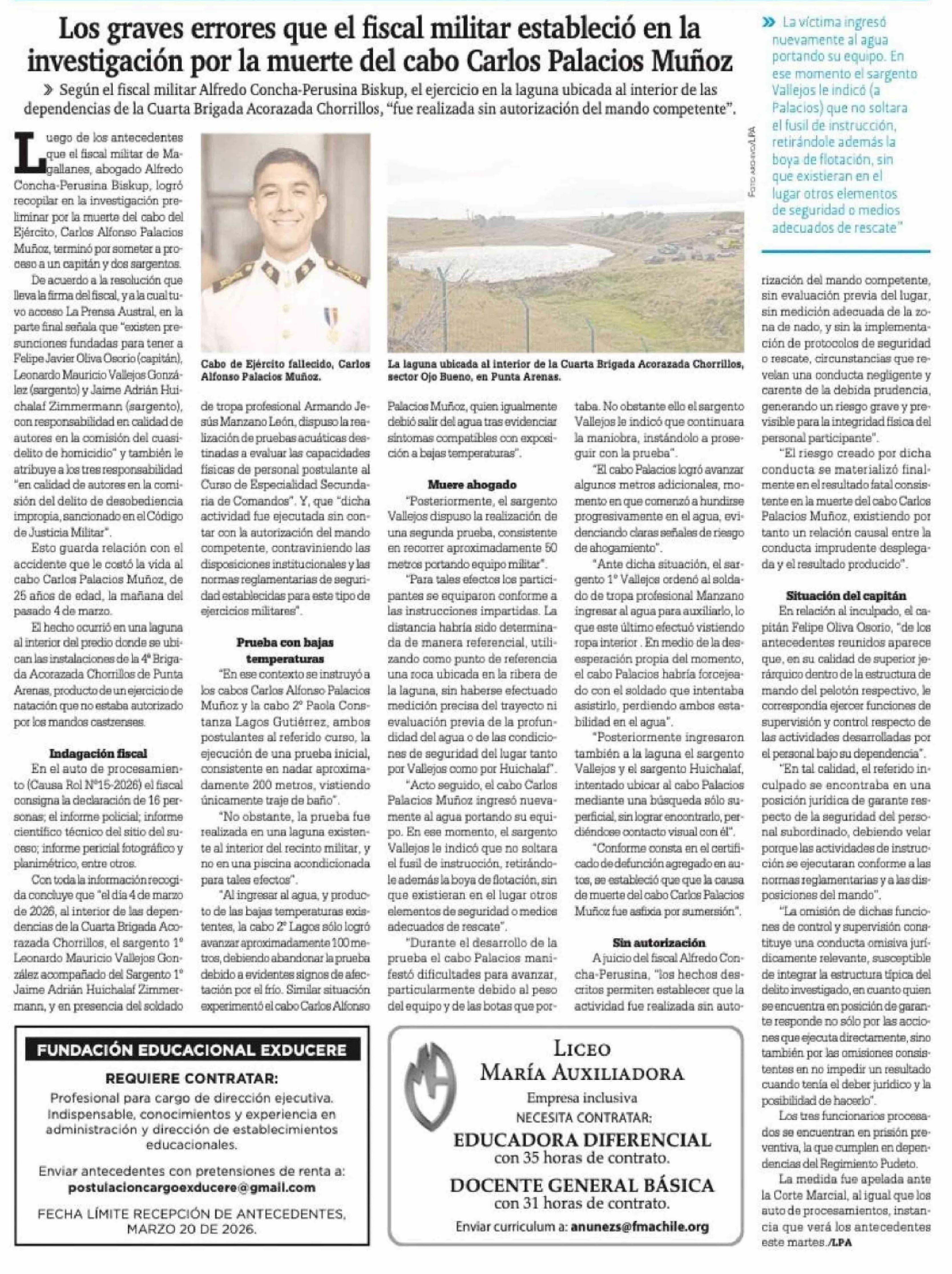 Los graves errores que el fiscal militar estableció en la investigación por la muerte del cabo Carlos Palacios Muñoz 16-03-2026 La Prensa Austral |