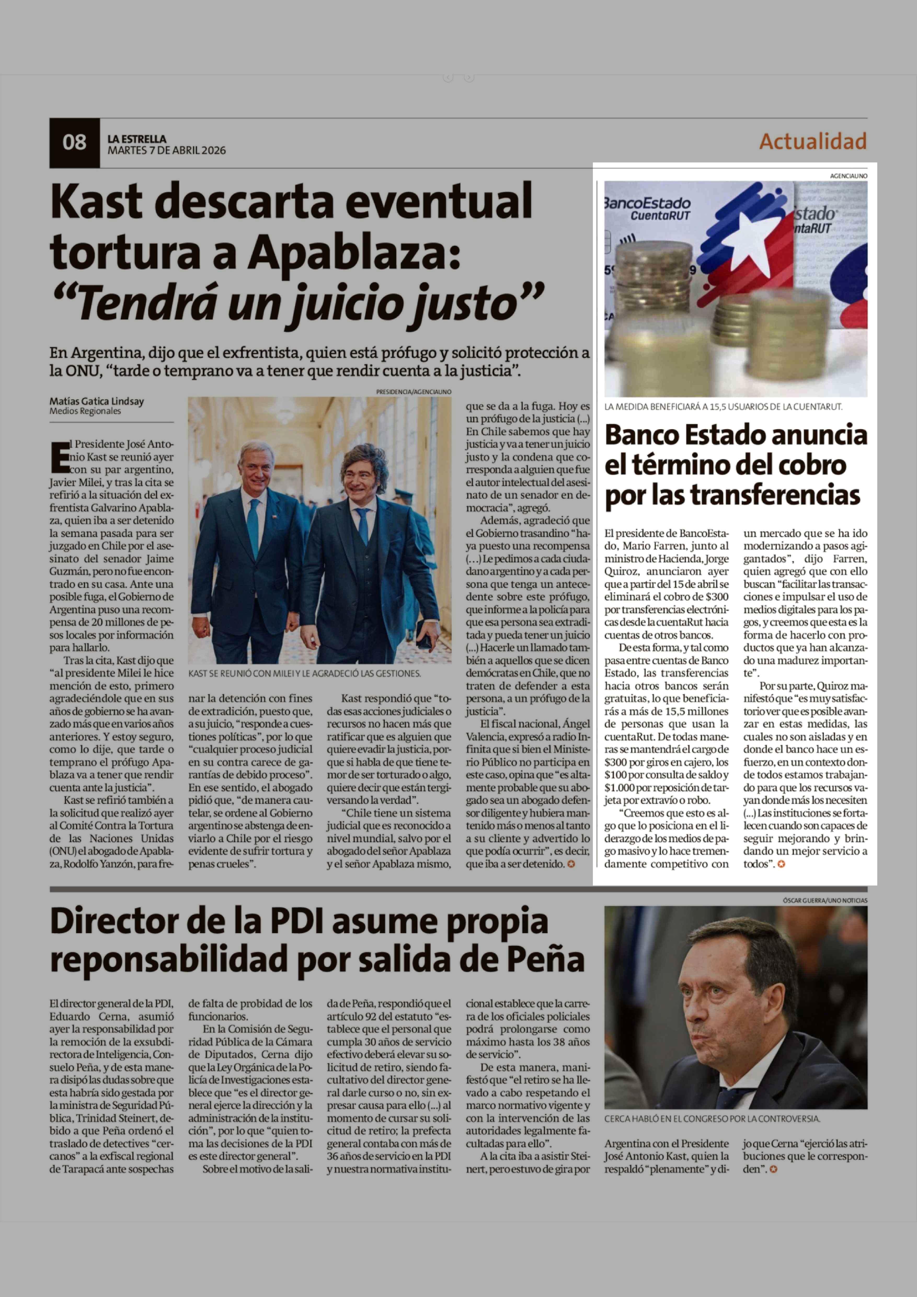 Banco Estado anuncia el término del cobro por las transferencias 07-04-2026 La Estrella de Chiloé |