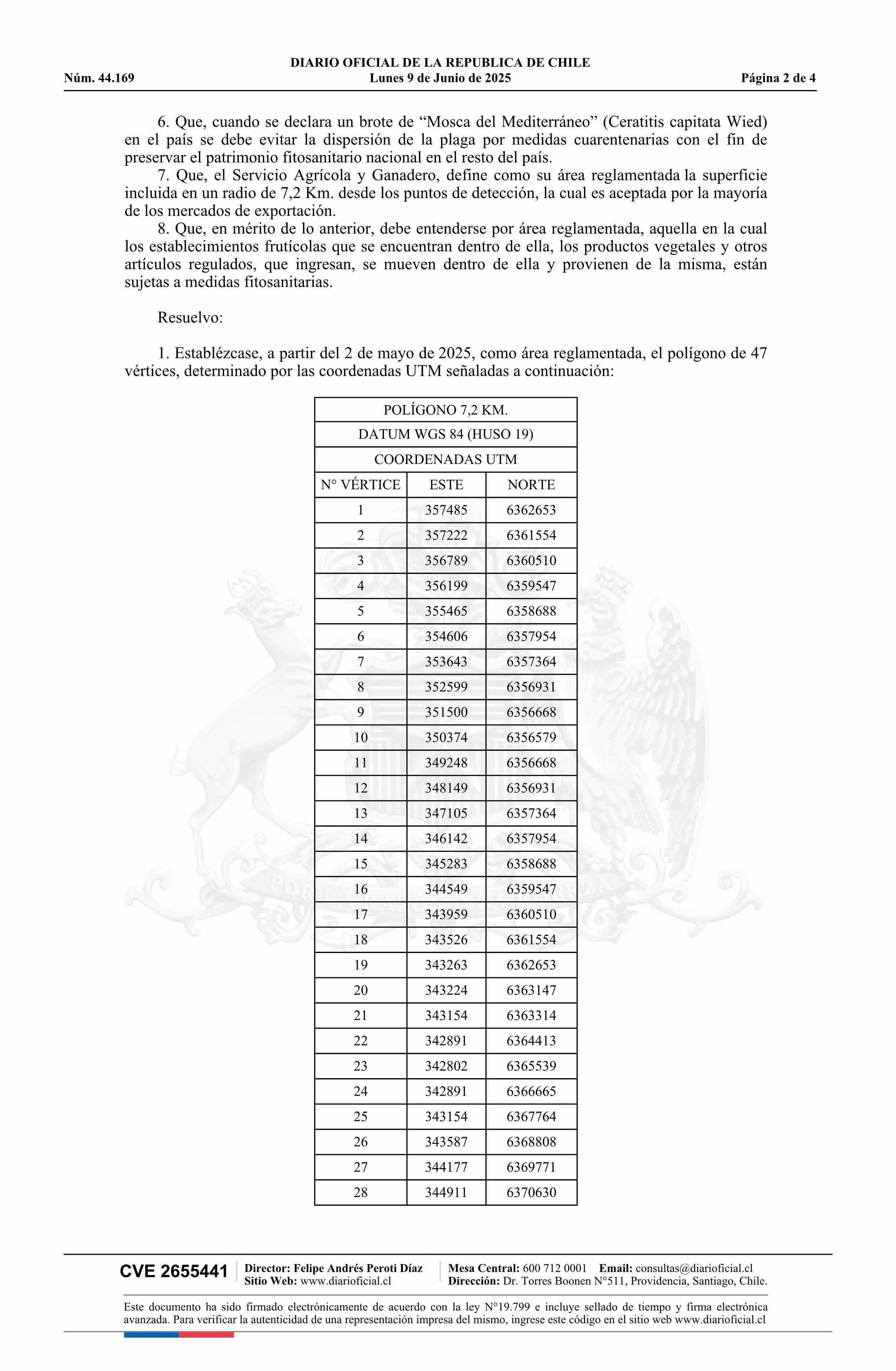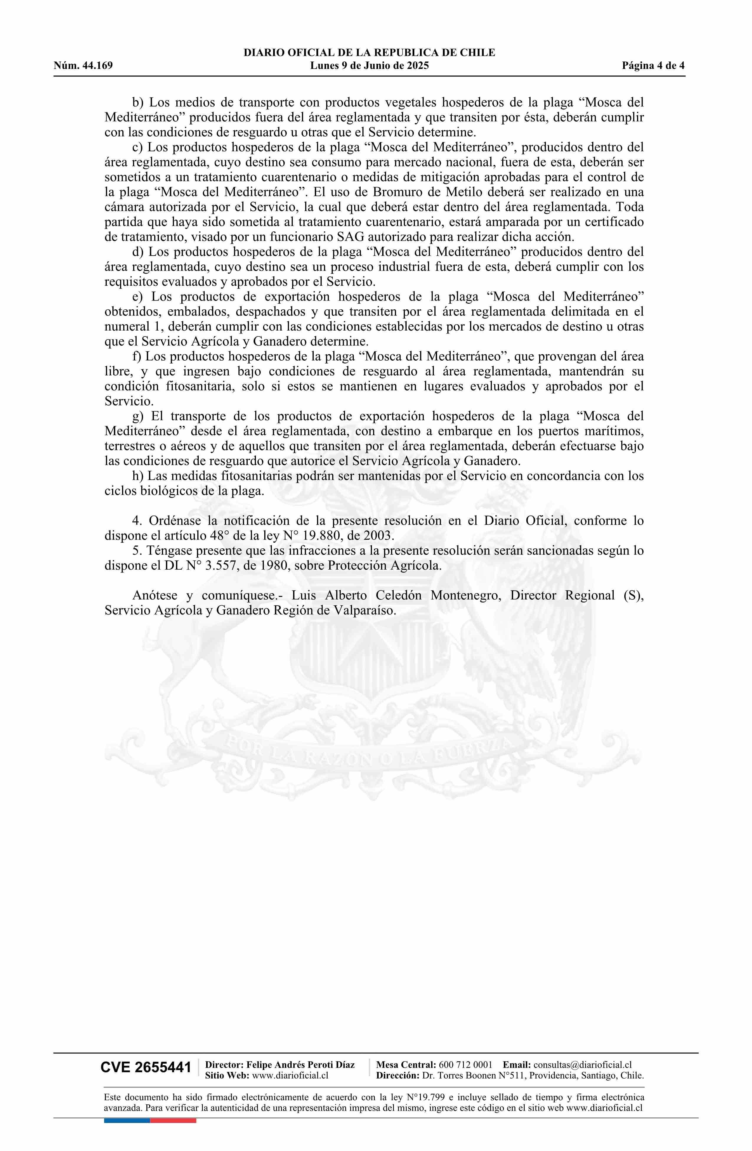 Resolución exenta número 1.172, de 2025.- Establece regulaciones cuarentenarias para el control y erradicación de la Mosca del Mediterráneo (Ceratitis capitata W.) en los lugares que indica