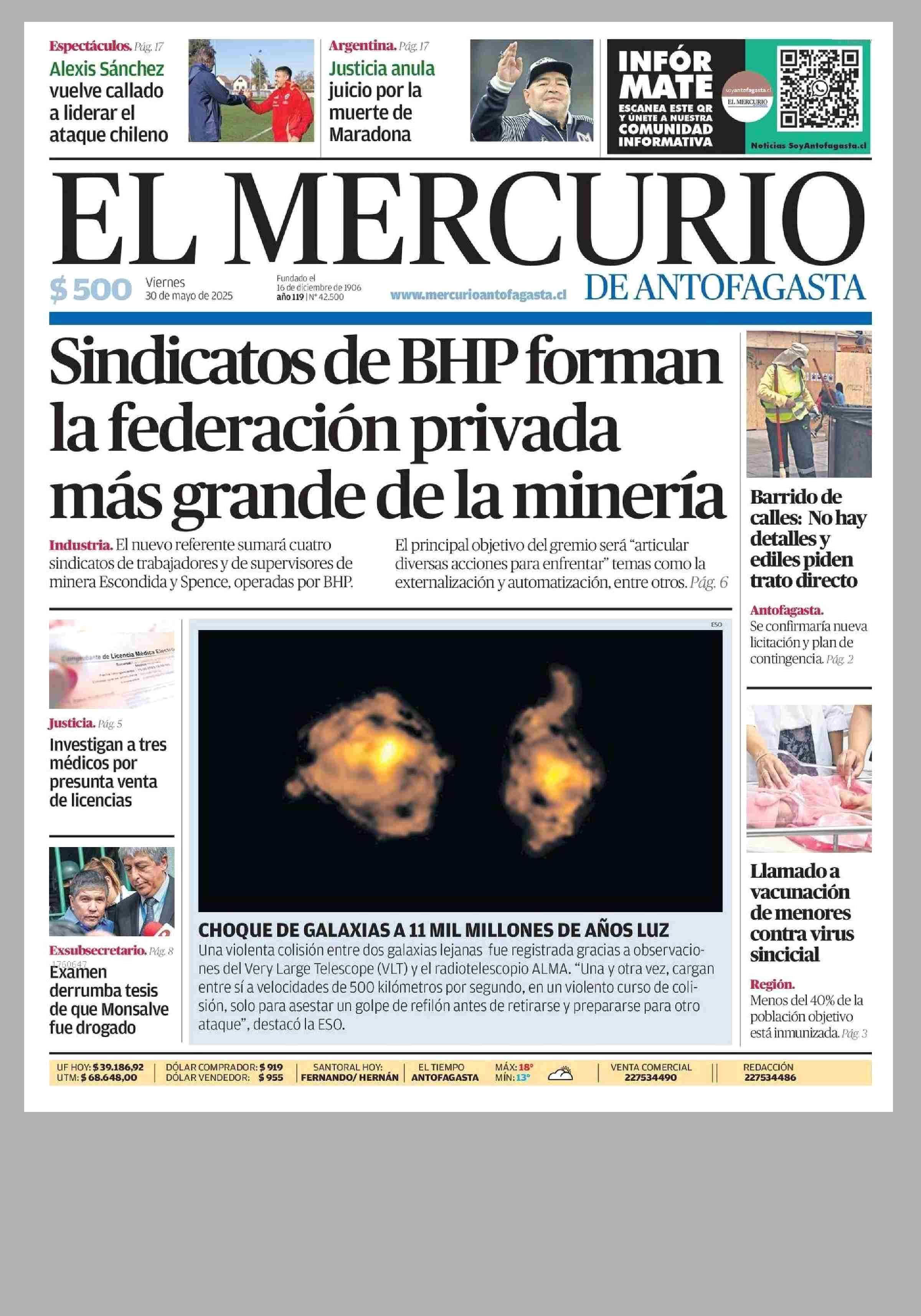 PORTADA EL MERCURIO DE ANTOFAGASTA - CHILE 30-05-2025 El Mercurio de Antofagasta |