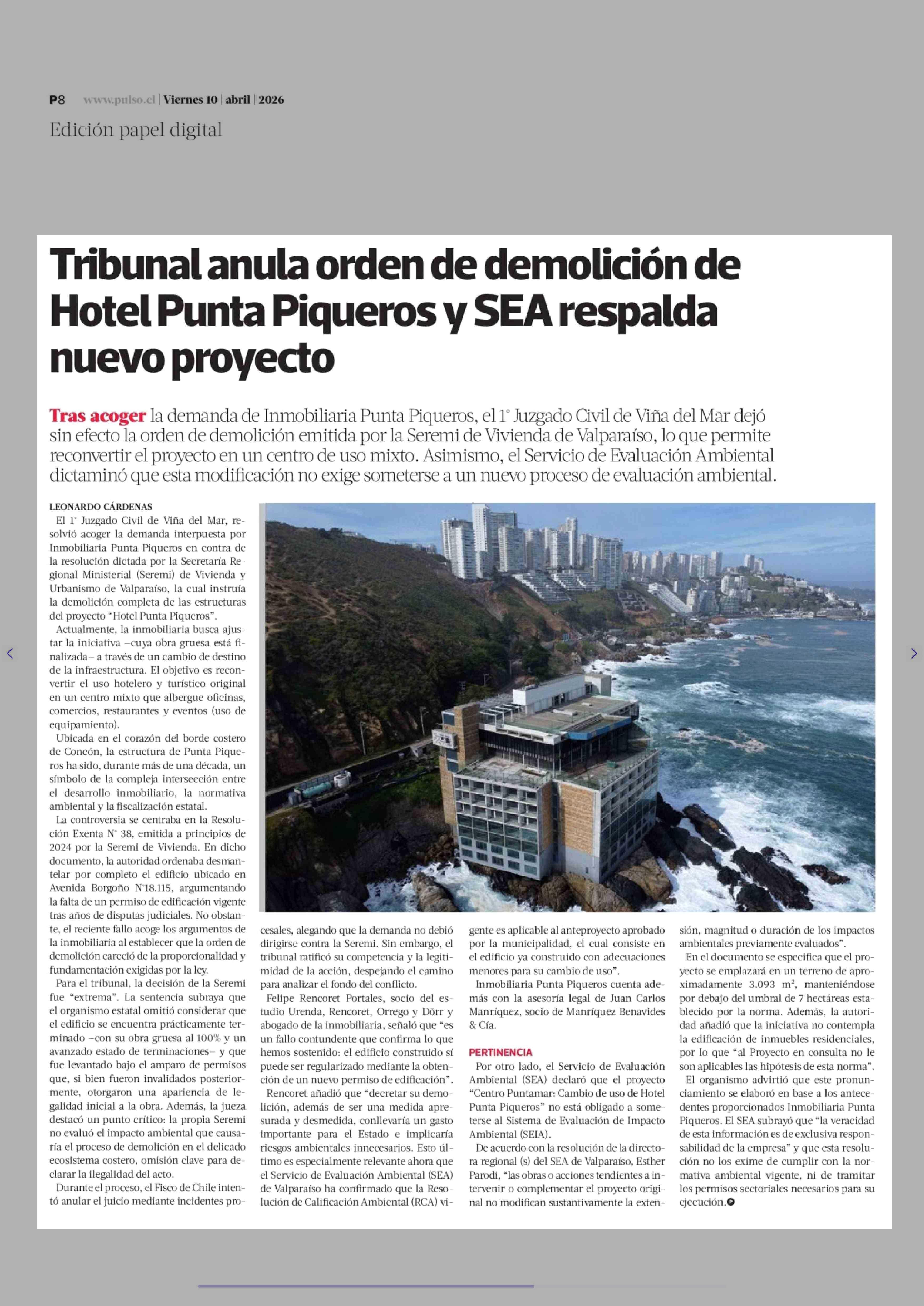 Tribunal anula orden de demolición de Hotel Punta Piqueros y SEA respalda nuevo proyecto 10-04-2026 La Tercera |