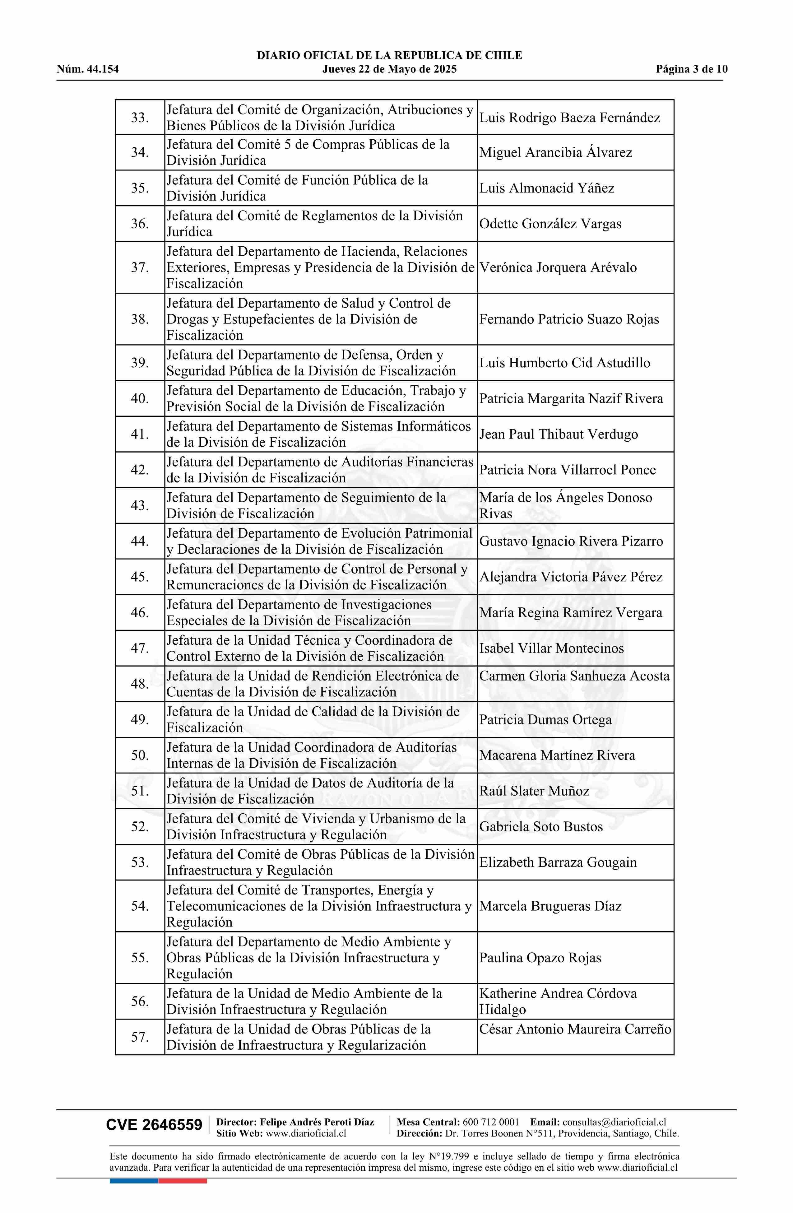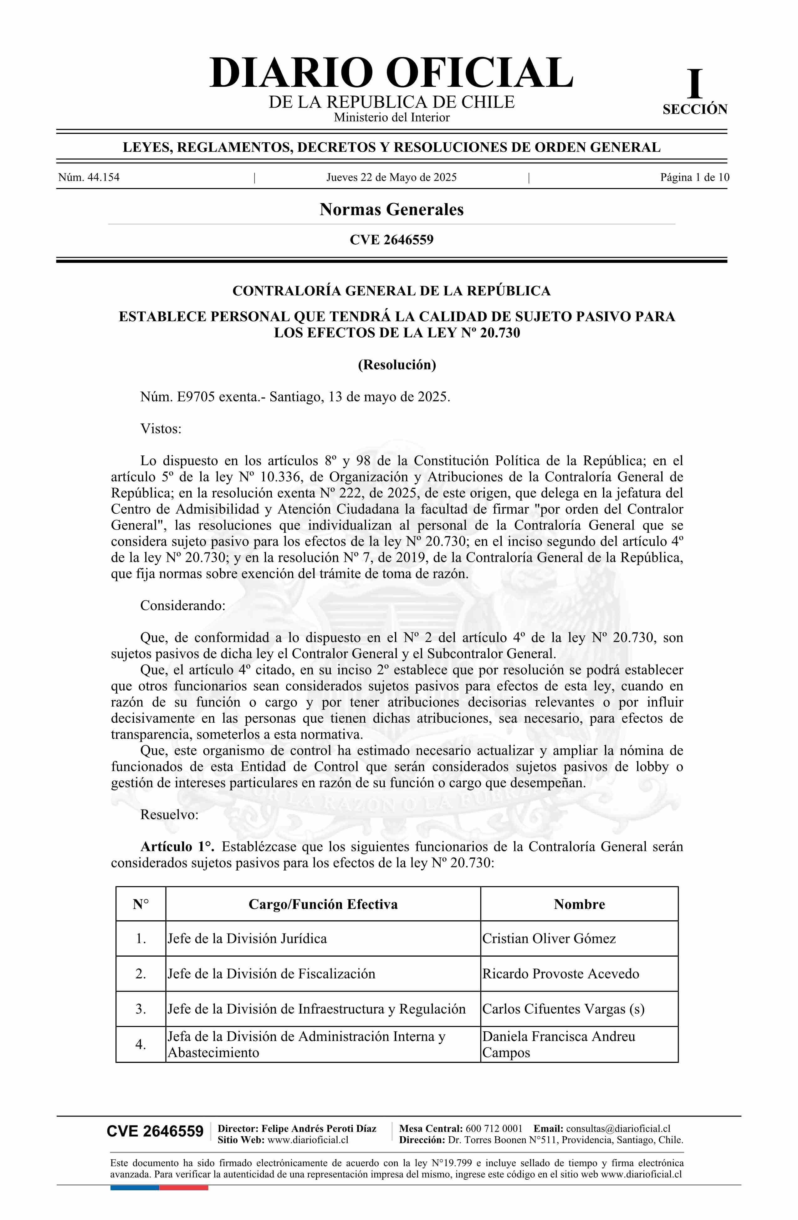 Resolución exenta número E9705, de 2025.- Establece personal que tendrá la calidad de sujeto pasivo para los efectos de la ley Nº 20.730 22-05-2025 Diario Oficial Edición Electrónica |