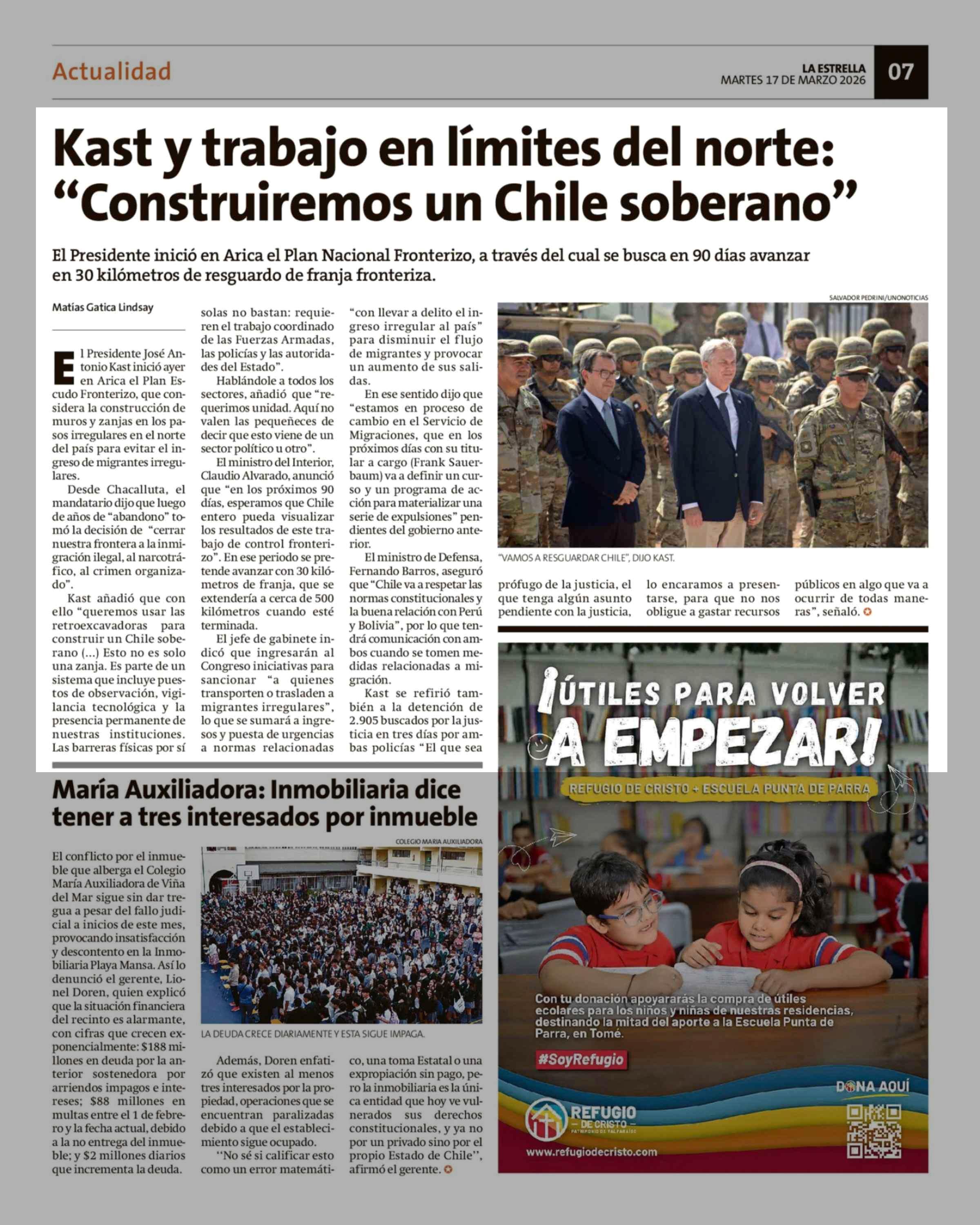 Kast y trabajo en límites del norte: "Construiremos un Chile soberano" 17-03-2026 La Estrella de Valparaíso |
