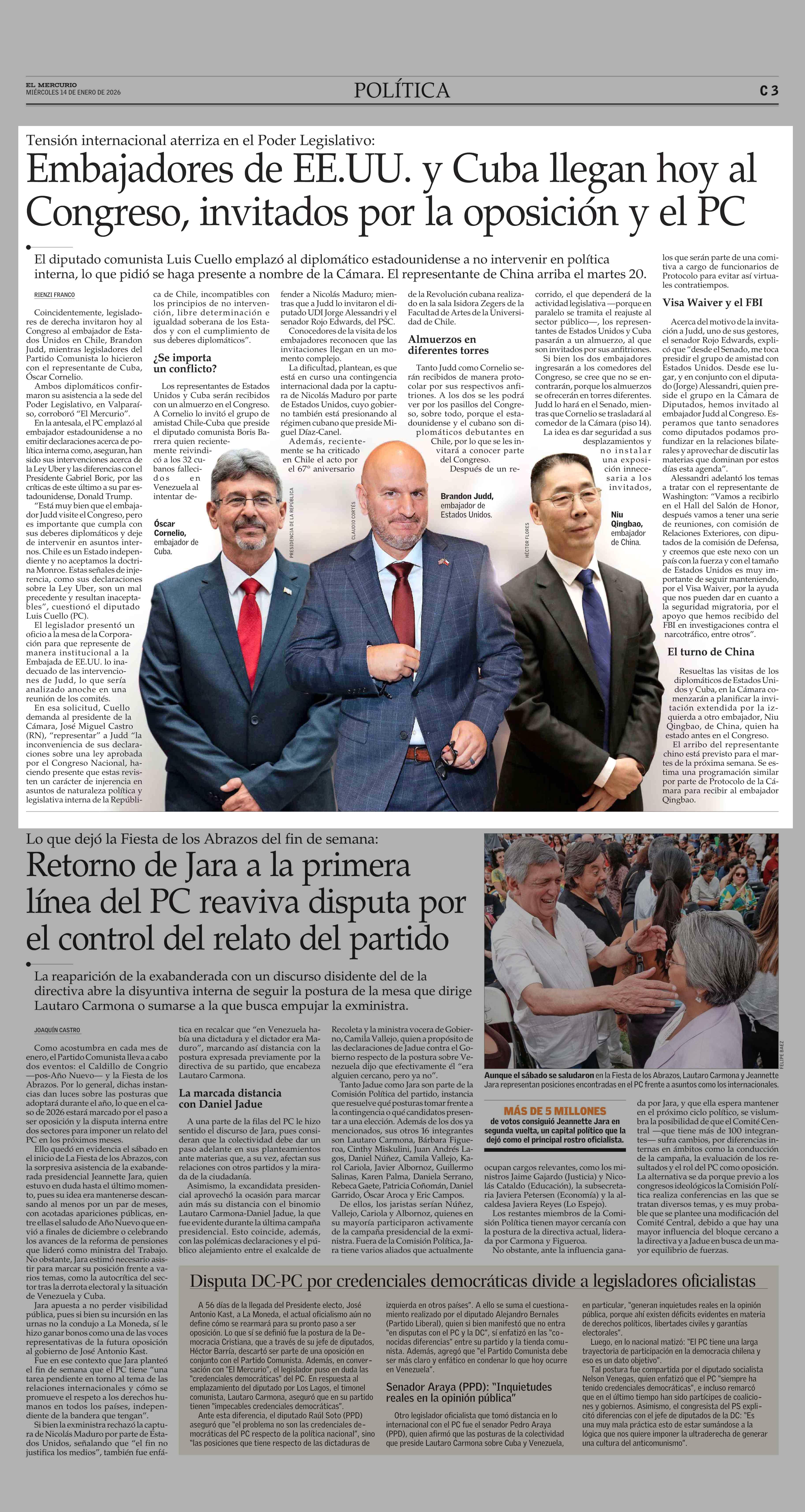 Embajadores de EE.UU. y Cuba llegan hoy al Congreso, invitados por la oposición y el PC 14-01-2026 El Mercurio |