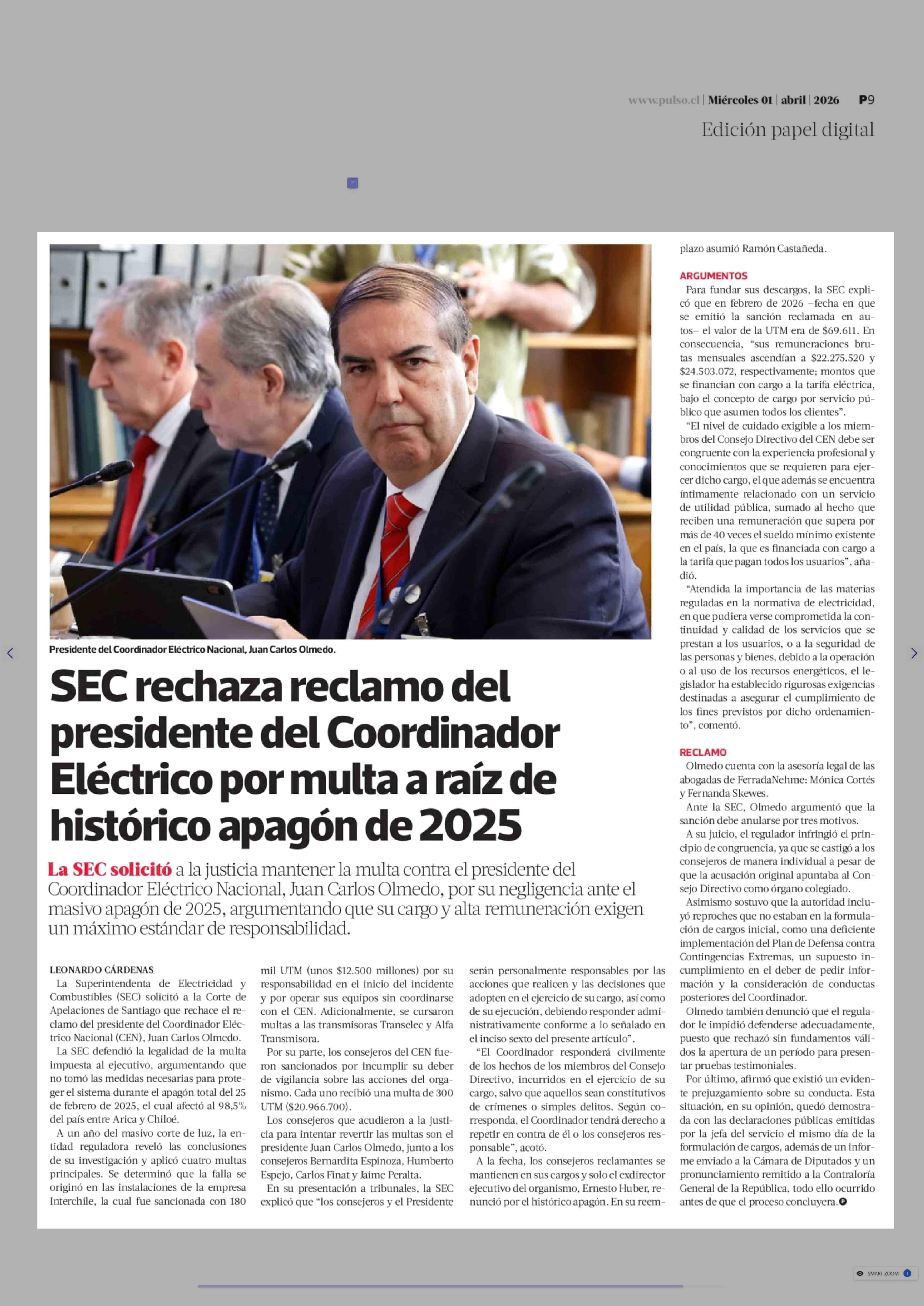 Título: SEC rechaza reclamo del presidente del Coordinador Eléctrico por multa a raíz de histórico apagón de 2025