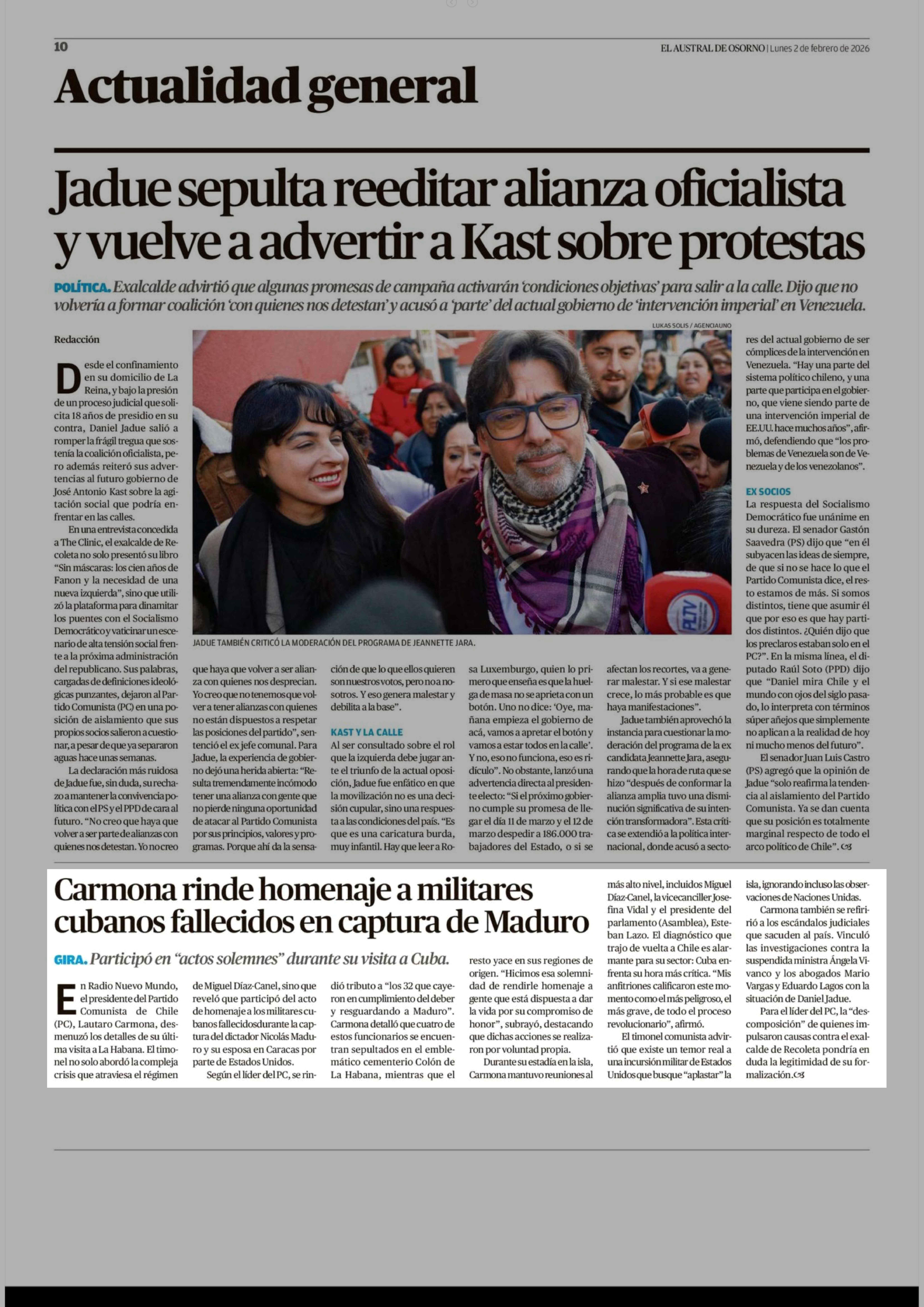 Carmona rinde homenaje a militares cubanos fallecidos en captura de Maduro 02-02-2026 El Austral de Osorno |